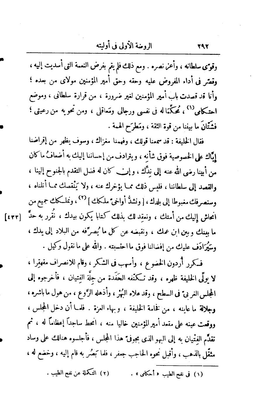 وقوى سلطانه واعز نصره. ومع ذلك فلم يقم بفرض النعمة التي أسديت إليه وقصر في أداء المفروض عليه وحقه وحق أمير المؤمنين مولاي من بعده وأنا قد قصدت باب أمير المؤمنين لغير ضرورة من قرارة سلطاني وموضع احتكامي محكما له في نفسي ورجالي ومعاقلي ومن تحويه من رعيتي فشتان ما بيننا من قوة الثقة ومطرح الهمة.