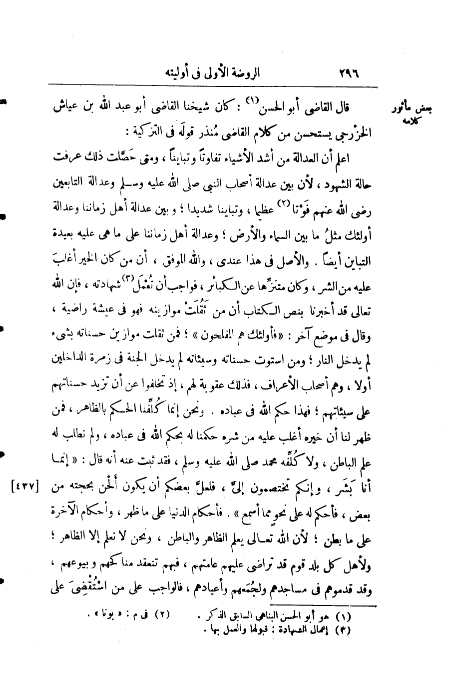 قال القاضي أبو الحسن: كان شيخنا القاضي أبو عبد الله بن عياش الخزرجي يستحسن من كلام القاضي منذر قوله في التزكية: اعلم إنَّ العدالة من أشد الأشياء تفاوتاً وتبايناً ومتى حصلت ذلك عرفت حالة الشهود لأن بين عدالة أصحاب النبي صلى الله عليه وسلم وعدالة التابعيين رضي الله عنهم فوتاً عظيماً وتبايناً شديداً وبين عدالة أهل زماننا وعدالة أولئك مثل ما بين السماء والأرض؛ وعدالة أهل زماننا على ما هي عليه بعيدة التباين أيضاً. والأصل في هذا عندي، والله الموفق، أنَّ من كان الخير أغلب عليه من الشر، وكان متنزها عن الكبائر فواجب أن تعمل شهادته، فإنَّ الله تعالى قد أخبرنا بنص الكتاب أنَّ من ثقلت موازينه فهو في عيشة راضية، وقال في موضع آخر:) فأولئك هم المفلحون (؛ فمن ثقلت موازين حسناته بشيء لم يدخل النار؛ ومن استوت حسناته وسيئاته لم يدخل الجنة في زمرة الداخلين أولاً، وهم أصحاب الأعراف، فذلك عقوبة لهم، إذ تخلفوا عن أن تزيد حسناتهم على سيئاتهم؛ فهذا حكم الله في عباده. ونحن إنما كلفنا الحكم بالظاهر، فمن ظهر لنا أنَّ خيره أغلب عليه من شره حكمنا له بحكم الله في عباده، ولم نطلب له علم الباطن ولا كلفه محمّد صلى الله عليه وسلم فقد ثبت عنه أنه قال " إنّما أنا بشر، وإنكم تختصمون إليّ، فلعل بعضكم أن يكون ألحن بحجته من بعض، فأحكم له على نحو مما أسمع ". فأحكام الدنيا على ما ظهر، وأحكام الآخرة على ما بطن؛ لأن الله تعالى يعلم الظاهر والباطن، ونحن لا نعلم إلاّ الظاهر؛ وأهل كل قوم قد تراضى عليهم عامتهم فبهم تنعقد منكحهم وبيعهم وقد قدموهم في المساجد ولجمعهم وأعيادهم، فالواجب على من استقصى على