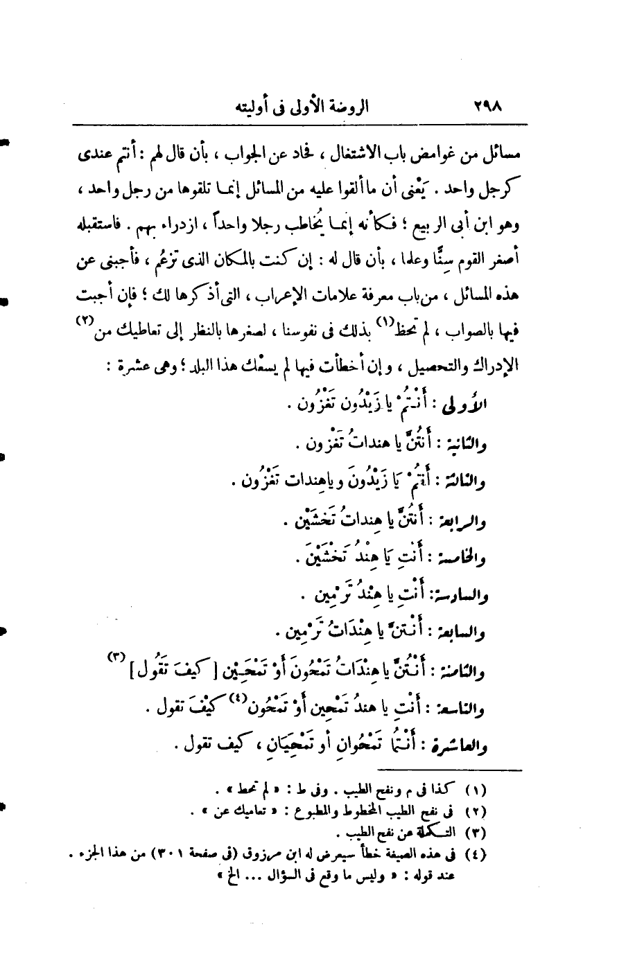 مسائل من غوامض باب الاشتغال، فحاد عن الجواب، بأن قال لهم: انتم عندي كرجل واحد. يعني أنَّ ما ألقوا عليه من المسائل إنّما تلقوا من رجل واحد، وهو أبن أبي الربيع؛ إنّما يخاطب رجلاً واحداً، ازدراء بهم. فاستقبله أصغر القوم سنا وعلما، بأن قال له: إنَّ كنت بالمكان الذي تزعم، فأجبني عن هذه المسائل، من باب معرفة علامات الإعراب، التي أذكرها لك؛ فإنَّ أجبت فيها بالصواب، لم تحظ بذلك في نفوسنا، لصغرها بالنظر إلى تعاطيك من الإدارك والتحصيل، وإنَّ أخطأت فيها لم يسعك هذا البلد، وهي عشيرة: الأولى: انتم يا زيدون تغزون.