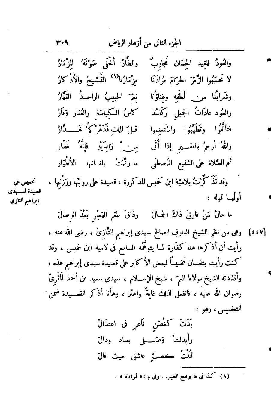 وهي من نظم الشيخ العارف الصالح سيدي إبراهيم التازي رضي الله عنه رأيت أن أذكرها هنا كفارة لمّا يتوهمه السامع في لامية أبن خميس وقد كنت رأيت بتلمستان تخميسا لبعض الأكابر على قصيدة سيدي إبراهيم هذه وأنشدته الشيخ مولانا العم شيخ الإسلام سيدي سعيد بن أحمد المقري رضي الله عنه فانفعل لذلك غاية واهتز وهأنا أذكر القصيدة ضمن التخميس وهو:
