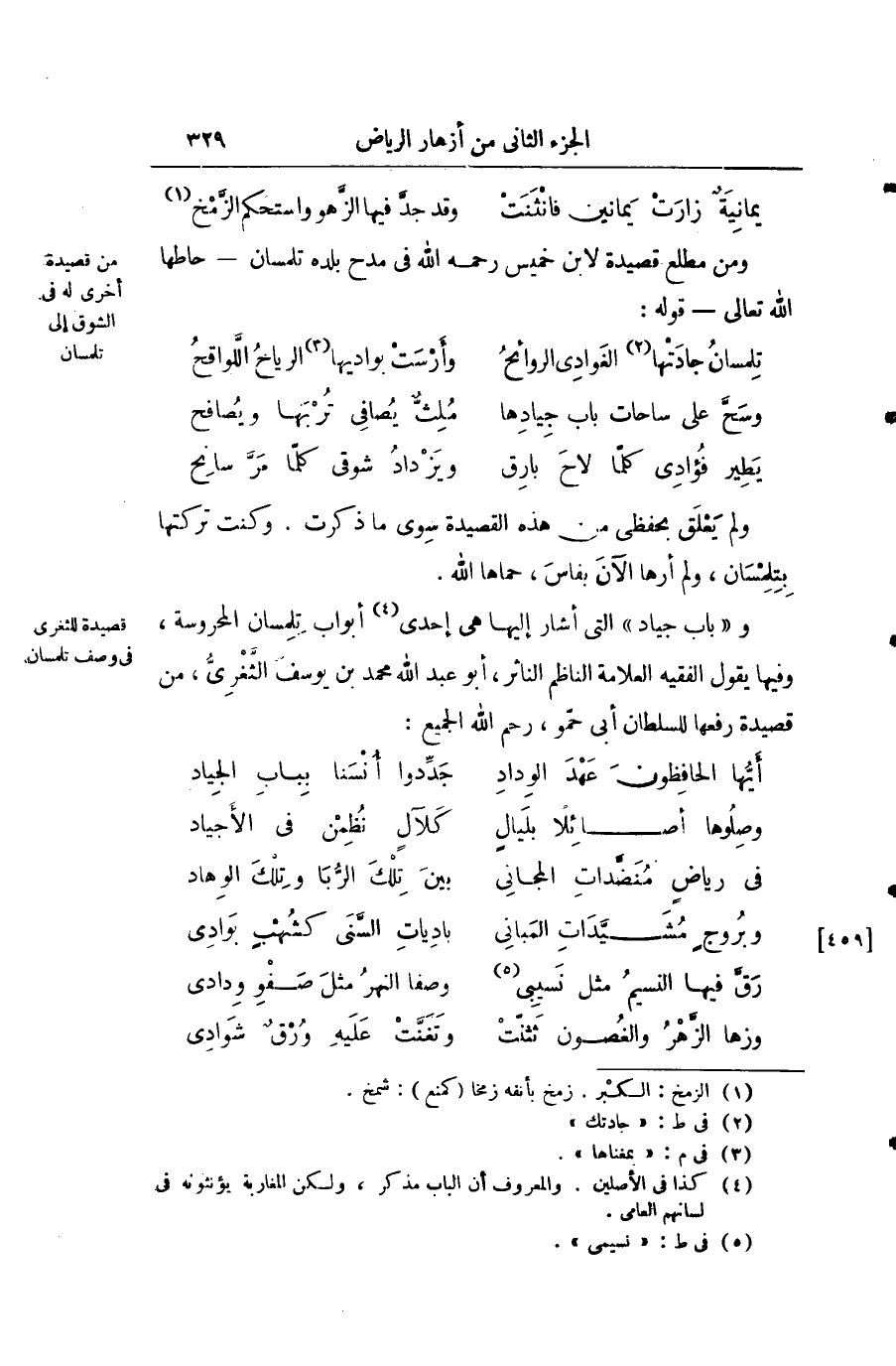 ومن مطلع قصيدة لابن خميس رحمه الله في مدح بلدة تلمستان حاطها الله تعالى قوله: