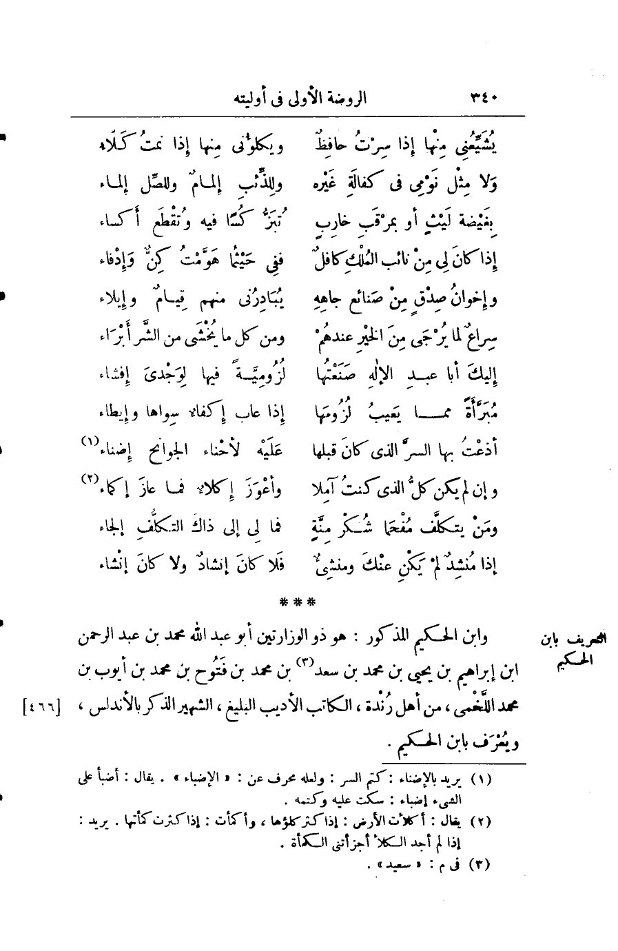 وأبن الحكيم المذكور: هو ذو الوزارتين أبو عبد الله محمّد بن عبد الرحمن أبن إبراهيم بن يحيى بن محمّد بن سعد بن محمّد بن فتوح بن محمّد بن أيوب بن محمّد اللخمي، من أهل رندة، الكاتب الأديب البليغ الشهير الذكر بالأندلس، ويعرف بابن الحكيم