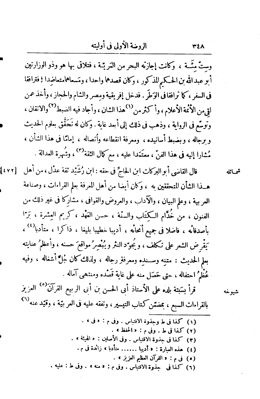 وست مائة، وكانت إجازته البحر من المرية فتلاقى بها هو وذو الوزارتين أبو عبد الله بن الحكيم المذكور وكان قصدهما واحد ومسعاهما متعاضداً؛ فترافقا في السفر، كما ترافقا في الوطر. فدخل إفريقية ومصر والشام والحجاز وأخذ عمن لقي من الأئمة الأعلام، وأكثر من هذا الشان وأجاد فيه الضبط والإتقان وتوسع في الرواية وذهب في ذلك إلى ابعد غاية. وكان له تحقق بعلوم الحديث وبزجاله، وضبط أسناده، ومعرفة انقطاعه واتصاله، إماماً في هذا الشأن مشار إليه في هذا الفن معتمداً عليه مع كمال اثقة وشهوة العدالة.