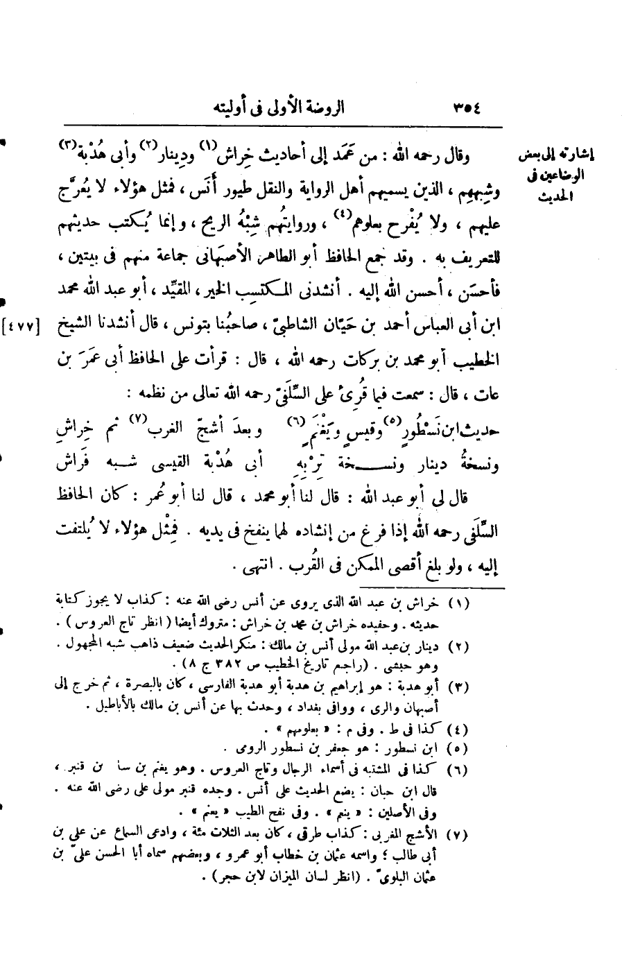 قال رحمه الله: من عمد إلى أحاديث خراش ودينار وأبي هدبة وشبهم الذين يسميهم أهل الرواية والنقل طيور أنس فمثل هؤلاء لا يعرج عليهم ولا يفرح بعلوهم وروايتهم شبه الريح وإنما يكتب حديثهم للتعريف به. وقد جمع الحافظ أبو الطاهر الأصبهاني جماعة منهم في بيتين فأحس أحسن الله إليه. أنشدني المكتسب الخير المقيد أبو عبد الله محمّد أبن أبي العباس أحمد بن حيان الشاطبي صاحبنا بتونس قال أنشدنا الشيخ الخطيب أبو محمّد بن بركات رحمه الله قال: قرأت على الحافظ أبي عمر بن عات قال: سمعت فيما قري على السلفى رحمه الله تعالى من نظمه: