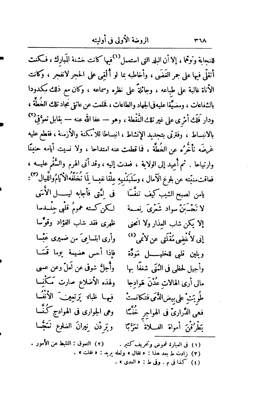 للنجابة توهما إلاّ إنَّ البلد التي فيها كانت خشنة المباركة فكنت اتقلى فيها على جمر الغضى وأخابطها بما لو ألقي على الحجر لا نفجر وكانت الأناة غالبة على طباعه وجائلة على نظره وسمعه وكان مع ذلك مكدودا بالشفاعات ومضيقا عليه في الجهاد والطاعات فخلعت عن عاتقي نجاد تلك الخطة ودار فلك أمري على غير تلك النقطة وهو عفا الله عنه يقابل توقعي ابلنبساط وفترتي بتجديد الإنشاط انبساطا الأمكنة والأزمنة فقطع عليه غرضه تأخره عن الخطة فما قطعت عنه امتداحا ولا نسيت أيامه حنينا وارتياحا. ثم أعيد إلى الولاية فعدت إليه وقد أتى الهرم والسقم عليه فعاقت منيته عن بلوغ الآمال سلبتني علقا نفيسا لمّا تخلف الأيام والليال: