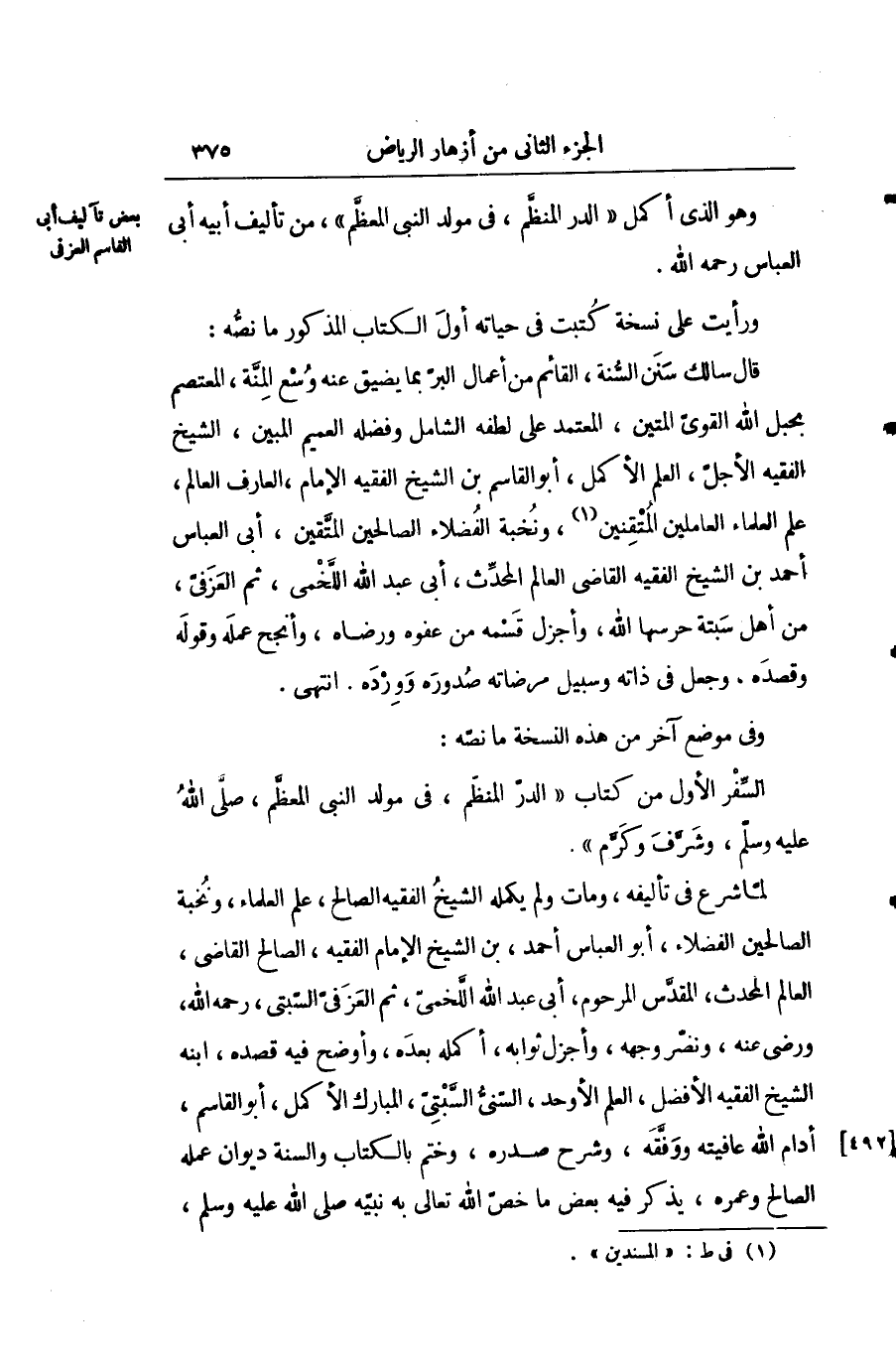 وفي موضع آخر من هذه النسخة ما نصه: السفر الأول من كتاب " الدر المنظم في مولد النبي المعظم، صلى الله عليه وسلم، وشرف وكرم ".