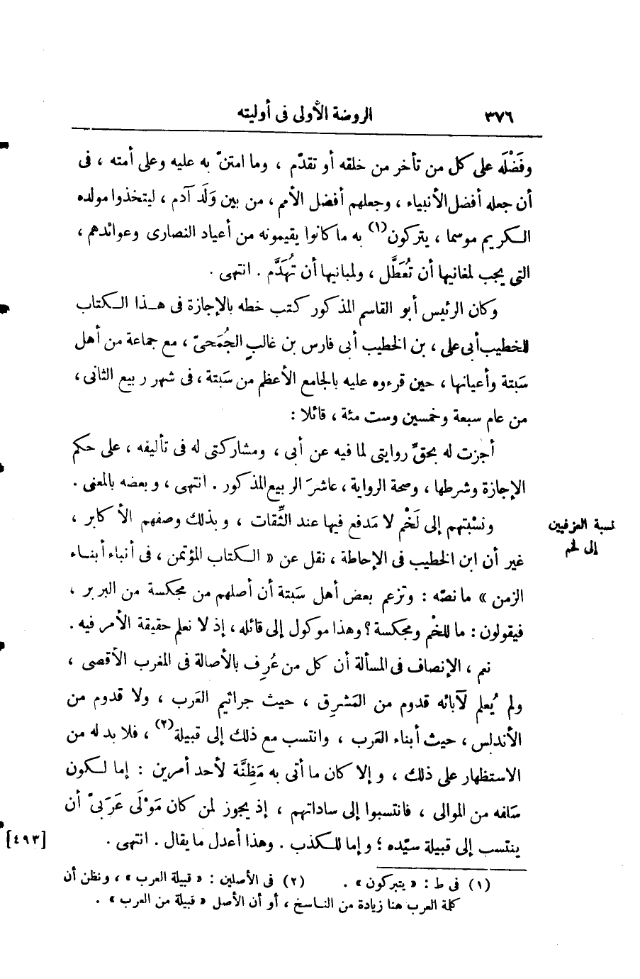 وكان الرئيس أبو القاسم المذكور كتب خطه بالإجازة في هذا الكتاب للخطيب أبي على، بن الخطيب أبي فارس بن غالب الجمحي، مع جماعة من أهل سبتة وأعيانها، حين قرءوه عليه بالجامع الأعظم من سبتة، في شهر ربيع الثاني، من عام سبعة وخمسين وست مائة، قائلا: أجزت له بحق روايتي لمّا فيه عن أبي، ومشاركتي له في تأليفه، على حكم الإجازة وشرطها، وصحة الرواية، عاشر الربيع المذكور. انتهى. وبعضه بالمعنى. ونسبهم إلى لخم لا مدفع فيها عند الثقات، وبذلك وصفهم الأكابر، غير أنَّ أبن الخطيب في الإحاطة، نقل عن " الكتاب المؤتمن، في أنباء أبناء الزمن " ما نصه: وتزعم بعض أهل سبتة أنَّ أصلهم من مجكسة من البربر، فيقولون: ما للخم ومجكسة؟ وهذا موكول إلى قائلة، إذ لا نعلم حقيقة الأمر فيه. نعم، الإنصاف في المسألة أنَّ كل من عرف بالأصالة في المغرب الأقصى، ولم يعلم لآبائه قدوم من المشرق، حيث جراثيم العرب، ولا قدوم من الأندلس، حيث أبناء العرب، وانتسب مع ذلك إلى قبيلة، فلا بد له من الاستظهار على ذلك، وإلاّ كان ما أتى به مظنة لأحد أمرين: أما لكون سلفه من الموالي، فانتسبوا إلى ساداتهم، إذ يجوز لمن كان مولى عربي أنَّ ينتسب إلى قبيلة سيده؛ وأما للكذب. وهذا أعدل ما يقال. انتهى.