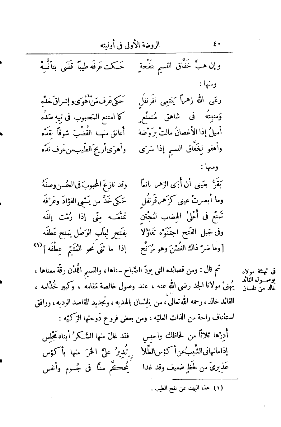 ثم قال: ومن قصائده التي يود الصباح سناها، والنسيم اللدن رقه معناها يهني مولانا الجد رضي الله عنه، عند وصول خالصة مقامه، وكبير خدامه، القائد خالد، رحمه الله تعالى، من تلمسان بالهداية، وتجديد المقاصد للوديه، ووفاق استئناف راحة من الذات العليه، ومن فروع دوحتها الزكيه: