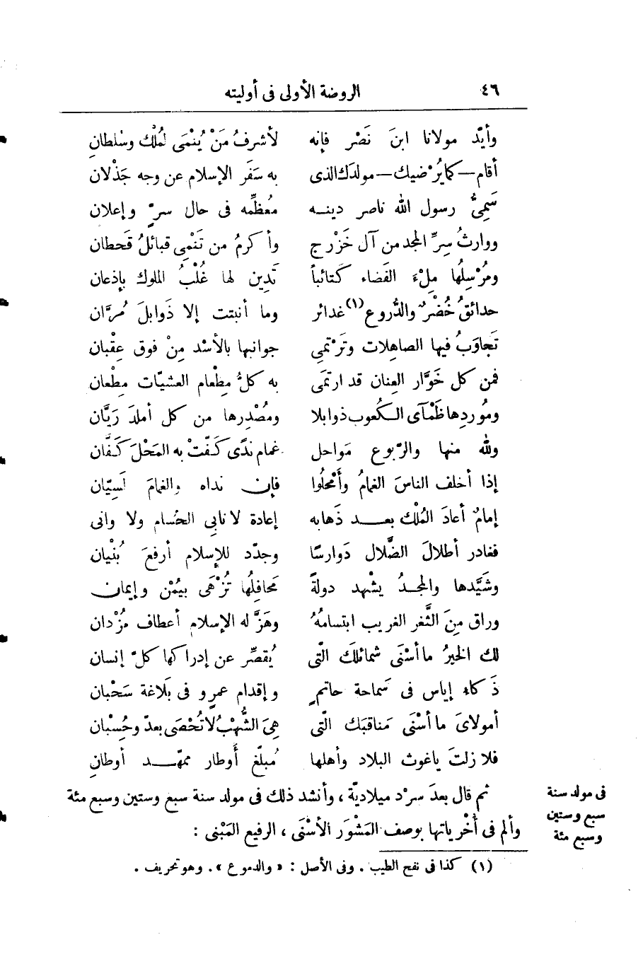 ثم قال بعد سرد ميلادية، وانشد ذلك في مولد سنة سبع وستين وسبع مائة وألم في أخرياتها بوصف المشور الأسنى، الرفيع المبنى: