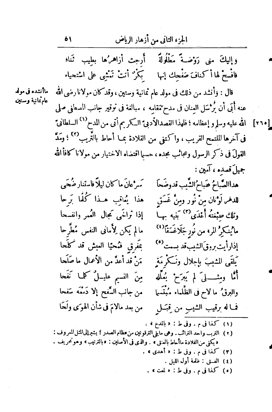 قال: وأنشد من ذلك في مولد عام ثمانية وستين وقد كان مولانا رضي الله عنه أبي أن يرسل العنان في مدح مقامه مبالغة في توقير جانب المصطفى صلى الله عليه وسلم وإعظامه فلهذا القصد الأدبي الكريم أتى من المدح السلطاني في آخرها الملتمح القريب واكتفى من القلادة بما أحاط بالترتيب ومدّ القول في ذكر الرسول وعجائب مجده حسبما اقتضاه الاختيار من مولانا كافأ الله جميل قصده آمين: