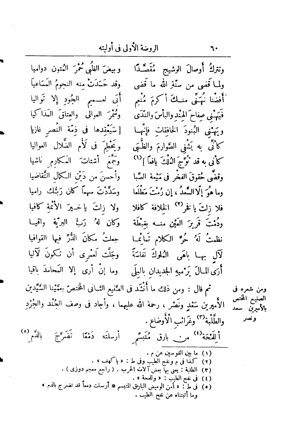 ثم قال: ومن ذلك ما أنشد في الصنيع الثاني المختص بعمينا السيدين الأمير بن سعد ونصر رحمة الله عليهما وأجاد في وصف الجند والجرد والطلبة وغرائب الأوضاع.