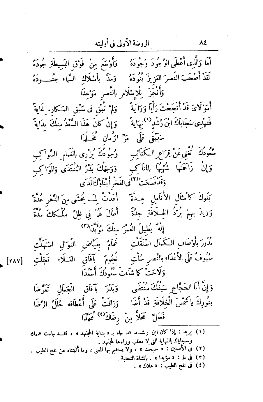 بنورك يا شمس الخلافة قد أضا ... وراقت على أعطافه حلل الرضا