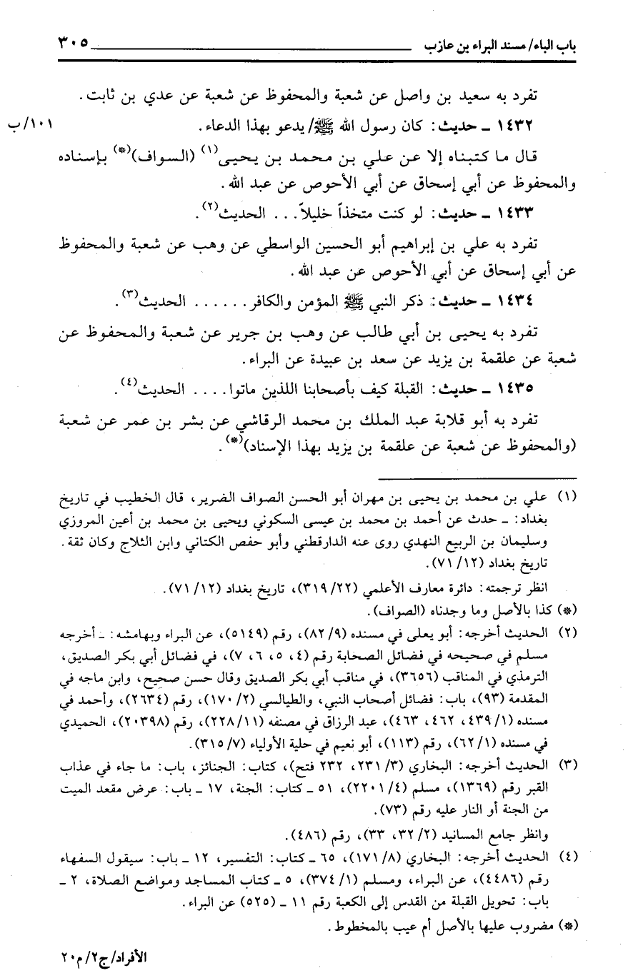 تفرد بِهِ يحيى بن أبي طَالب عَن وهب بن جرير عَن شُعْبَة وَالْمَحْفُوظ عَن شُعْبَة عَن عَلْقَمَة بن يزِيد عَن سعد بن عُبَيْدَة عَن الْبَراء.