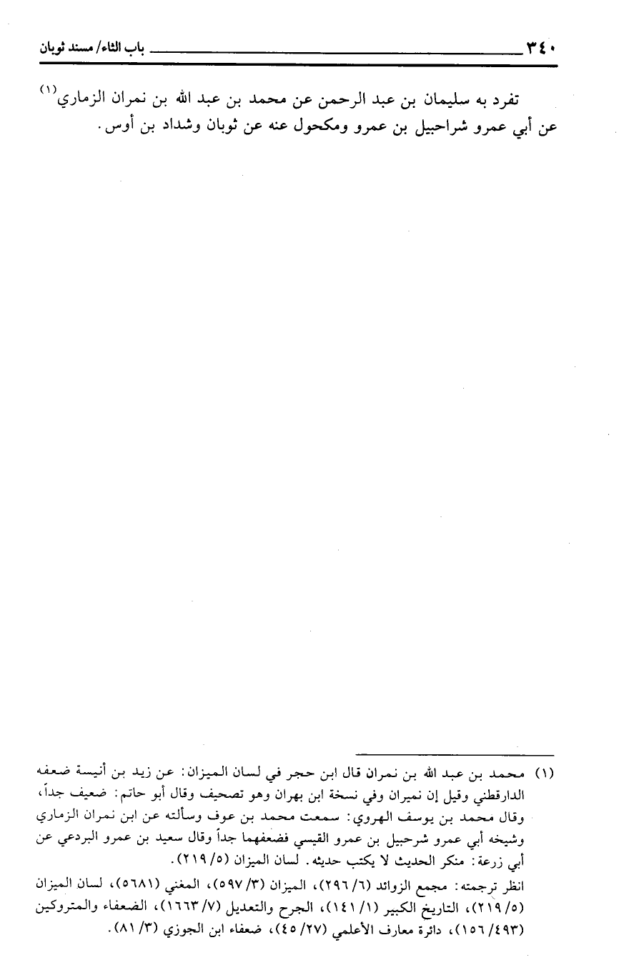 تفرد بِهِ سُلَيْمَان بن عبد الرَّحْمَن عَن مُحَمَّد بن عبد الله بن نمران الزماري عَن أبي عَمْرو شراحبيل بن عَمْرو وَمَكْحُول عَنهُ عَن ثَوْبَان وَشَدَّاد بن اوس.