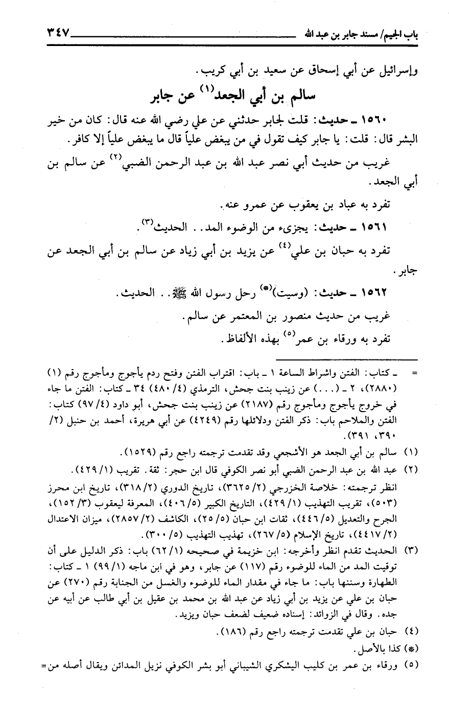 1560 - حَدِيث: قلت لجَابِر حَدثنِي عَن عَليّ رَضِي الله عَنهُ قَالَ: كَانَ من خير الْبشر قَالَ: قلت: يَا جَابر كَيفَ تَقول فِي من يبغض عليا قَالَ مَا يبغض عليا إِلَّا كَافِر.