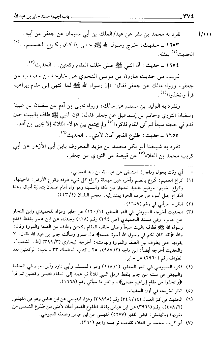 وَتفرد بِهِ الْوَلِيد بن مُسلم عَن مَالك، وَرَوَاهُ يحيى بن آدم عَن سُفْيَان بن عُيَيْنَة وسُفْيَان الثَّوْريّ وحاتم بن إِسْمَاعِيل عَن جَعْفَر فَقَالَ: ((إِن النَّبِي طَاف بِالْبَيْتِ حِين قدم فِي حجَّته سبعا ثمَّ أَتَى الْمقَام فَذكره)) وَلم يجْتَمع بَين هَؤُلَاءِ الثَّلَاثَة إِلَّا يحيى بن آدم.