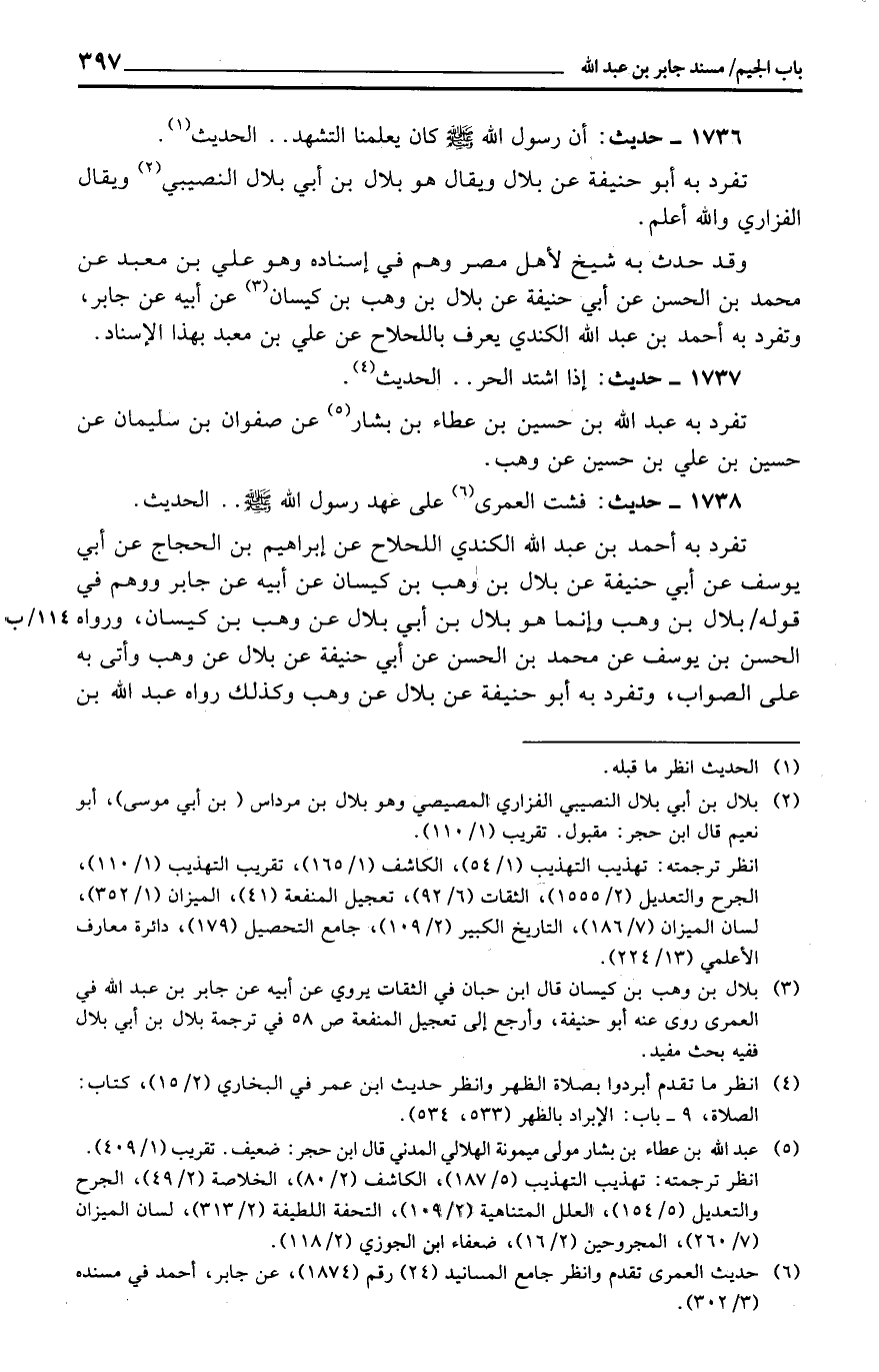 تفرد بِهِ أَحْمد بن عبد الله الْكِنْدِيّ اللحلاح عَن إِبْرَاهِيم بن الْحجَّاج عَن أبي يُوسُف عَن أبي حنيفَة عَن بِلَال بن وهب بن كيسَان عَن أَبِيه عَن جَابر وَوهم فِي قَوْله / بِلَال بن وهب وَإِنَّمَا هُوَ بِلَال بن أبي بِلَال عَن وهب بن كيسَان، وَرَوَاهُ الْحسن بن يُوسُف عَن مُحَمَّد بن الْحسن عَن أبي حنيفَة عَن بِلَال عَن وهب وأتى بِهِ على الصَّوَاب، وَتفرد بِهِ أَبُو حنيفَة عَن بِلَال عَن وهب وَكَذَلِكَ رَوَاهُ عبد الله بن