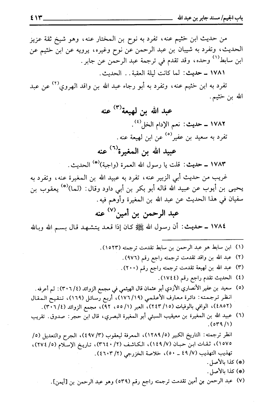 من حَدِيث ابْن خثيم عَنهُ، تفرد بِهِ نوح بن الْمُخْتَار عَنهُ، وَهُوَ شيخ ثِقَة عَزِيز الحَدِيث، وَتفرد بِهِ شَيبَان بن عبد الرَّحْمَن عَن نوح وَغَيره، يرويهِ عَن ابْن خثيم عَن ابْن سابط وَحده، وَقد تقدم فِي تَرْجَمَة عبد الرَّحْمَن عَن جَابر.