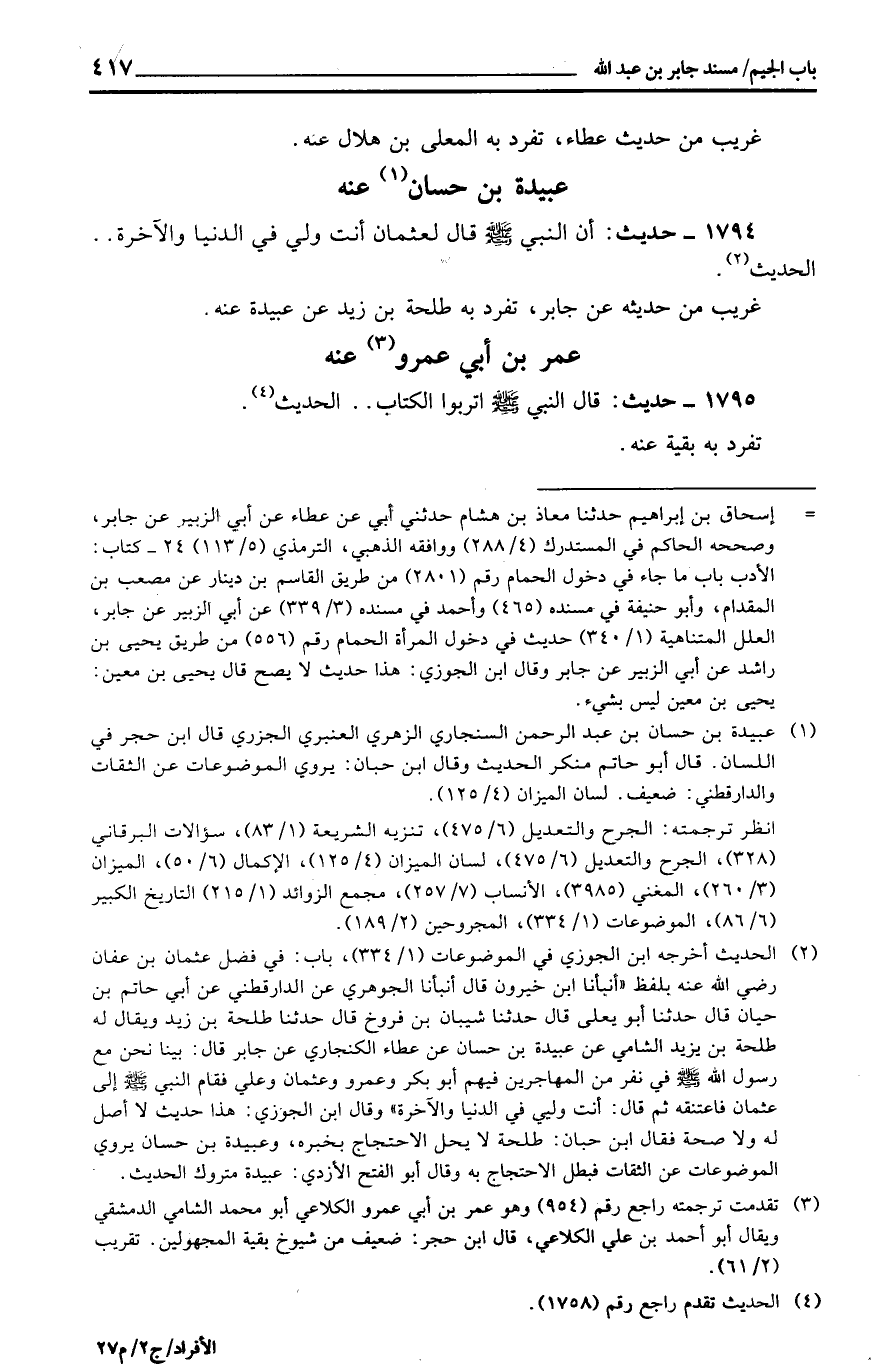 غَرِيب من حَدِيثه عَن جَابر، تفرد بِهِ طَلْحَة بن زيد عَن عُبَيْدَة عَنهُ.