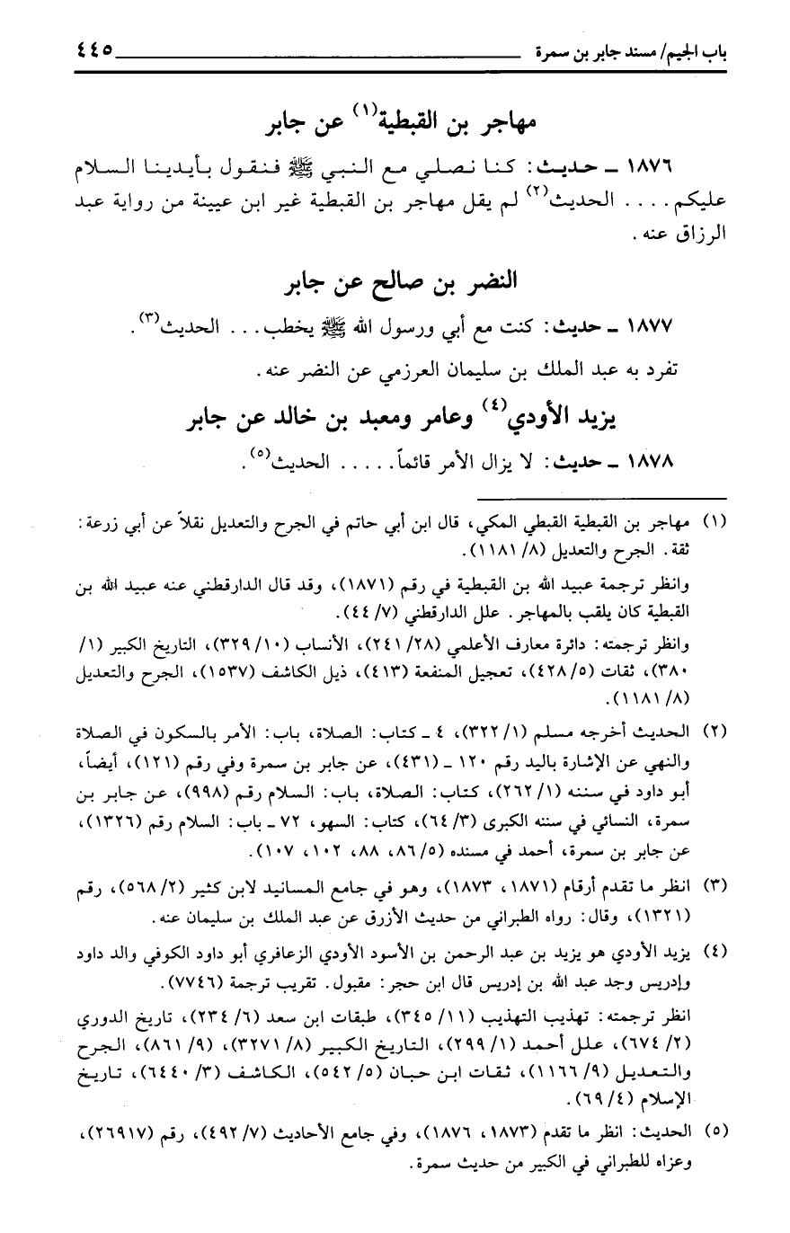 1876 - حَدِيث: كُنَّا نصلي مَعَ النَّبِي فَنَقُول بِأَيْدِينَا السَّلَام عَلَيْكُم ... . الحَدِيث لم يقل مهَاجر بن الْقبْطِيَّة غير ابْن عُيَيْنَة من رِوَايَة عبد الرَّزَّاق عَنهُ.