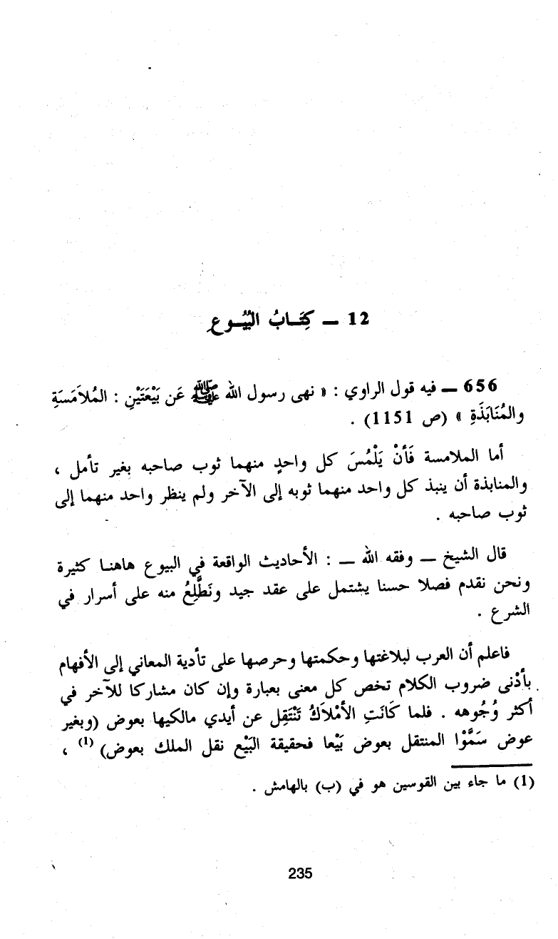656 - فيه قول الراوي: "نهى رسول الله - صلى الله عليه وسلم - عَن بَيْعَتَيْنِ: المُلاَمَسَةِ والمُنَابَذَةِ" (ص 1151).