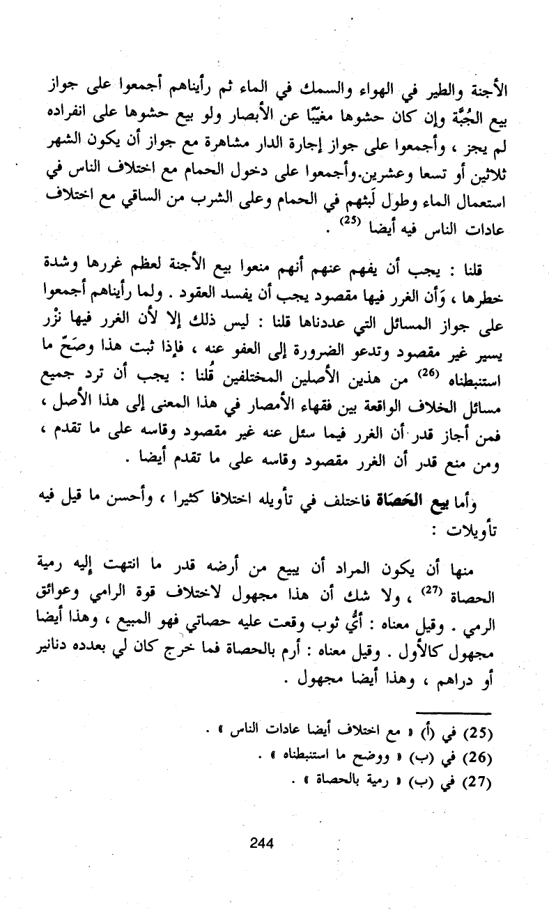 الأجنة والطير في الهواء والسمك في الماء ثم رأيناهم أجمعوا على جواز بيع الجُبَّة وان كان حشوها مغيّبًا عن الأبصار ولو بيع حشوها على انفراده لم يجز، وأجمعوا على جواز إجارة الدار مشاهرة مع جواز أن يكون الشهر ثلاثين أو تسعا وعشرين. وأجمعوا على دخول الحمام مع اختلاف الناس في استعمال الماء وطول لَبثهم في الحمام وعلى الشرب من الساقي مع اختلاف عادات الناس فيه أيضًا (¬25).