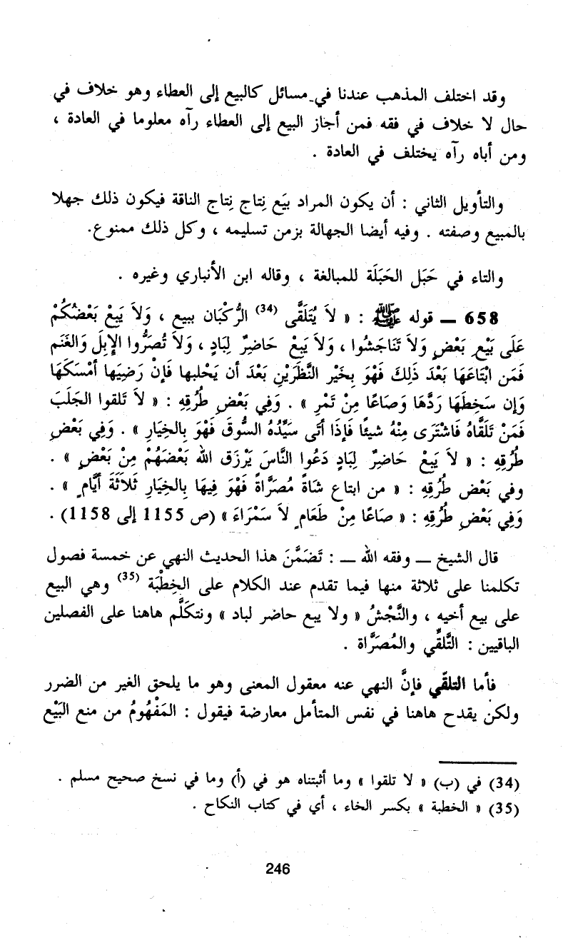 658 - قوله - صلى الله عليه وسلم -: "لاَ يُتَلَقَّى (¬34) الرُّكْبَان ببيع، وَلاَ يَبعْ بَعْضكُمْ عَلَى بَيْعِ بَعْضٍ وَلاَ تَنَاجَشُوا، وَلاَ يَبعْ حَاضِرٌ لِبَادٍ، وَلاَ تُصَرُّوا الإِبِلَ وَالغَنَم فَمَن ابْتَاعَهَا بَعْدَ ذَلِكَ فَهْوَ بِخَيْر النَّظَرَيْنِ بَعْدَ أن يَحْلبها فَإنْ رَضِيَها أمْسَكَهَا وَإن سَخِطَهَا رَدَّهَا وَصَاعًا مِنْ تَمْرِ". وَفِي بَعْضِ طُرُقِهِ: "لاَ تَلقوا الجَلَبَ فَمَنْ تَلَقَّاهُ فَاشْتَرَى مِنْهُ شيئًا فَإذَا أتى سَيِّدُهُ السُّوقَ فهْوَ بِالخِيَارِ". وَفِي بَعْضِ طُرُقِهِ: "لاَ يَبِعْ حَاضِرٌ لِبَادٍ دَعُوا النَّاسَ يَرْزَق الله بَعْضَهُمْ مِنْ بَعْضٍ". وفي بَعْض طُرُقِهِ: "من ابتاع شَاةً مُصَرَّاةً فَهْوَ فِيهَا بِالخِيَارِ ثَلاَثَةَ أيَّامٍ". وَفِي بَعْضِ طُرُقِهِ: "صَاعًا مِنْ طَعَامٍ لاَ سَمْرَاءَ" (ص 1155 إلى 1158).