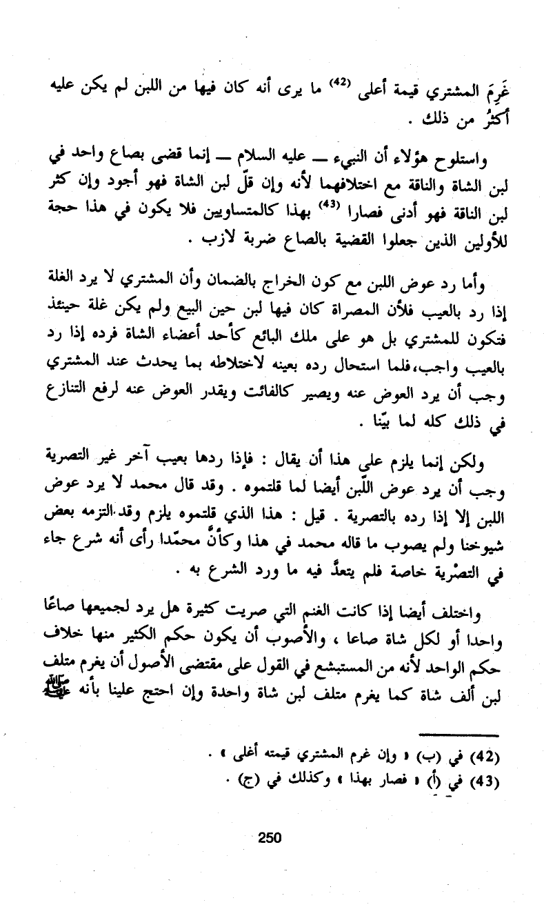 واستلوح هؤلاء أن النبيء -عليه السلام- إنما قضى بصاع واحد في لبن الشاة والناقة مع اختلافهما لأنه وإن قلّ لبن الشاة فهو أجود وإن كثر لبن الناقة فهو أدنى فصارا (¬43) بهذا كالمتساويين فلا يكون في هذا حجة للأولين الذين جعلوا القضية بالصاع ضربة لازب.