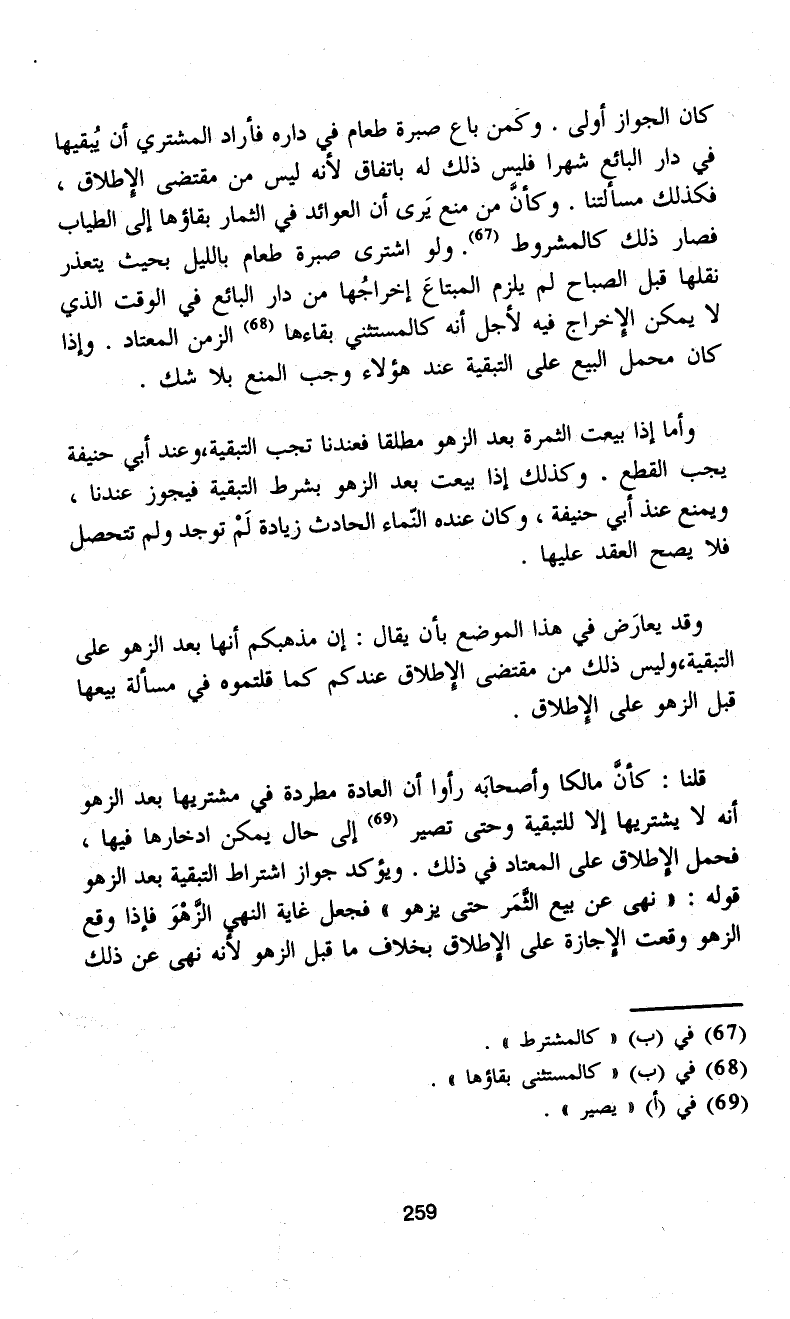 كان الجواز أولى. وكمن باع صبرة طعام في داره فأراد المشترى أن يُبقيها في دار البائع شهرا فليس ذلك له باتفاق لأنه ليس من مقتضى الإِطلاق، فكذلك مسألتنا. وكأنَّ من منع يَرى أن العوائد في الثمار بقاؤها إلى الطياب فصار ذلك كالمشروط (¬67). ولو اشترى صبرة طعام بالليل بحيث يتعذر نقلها قبل الصباح لم يلزم المبتاعَ إخراجُها من دار البائع في الوقت الذي لا يمكن الإِخراج فيه لأجل أنه كالمستثني بقاءها (¬68) الزمن المعتاد. وإذا كان محمل البيع على التبقية عند هؤلاء وجب المنع بلا شك.