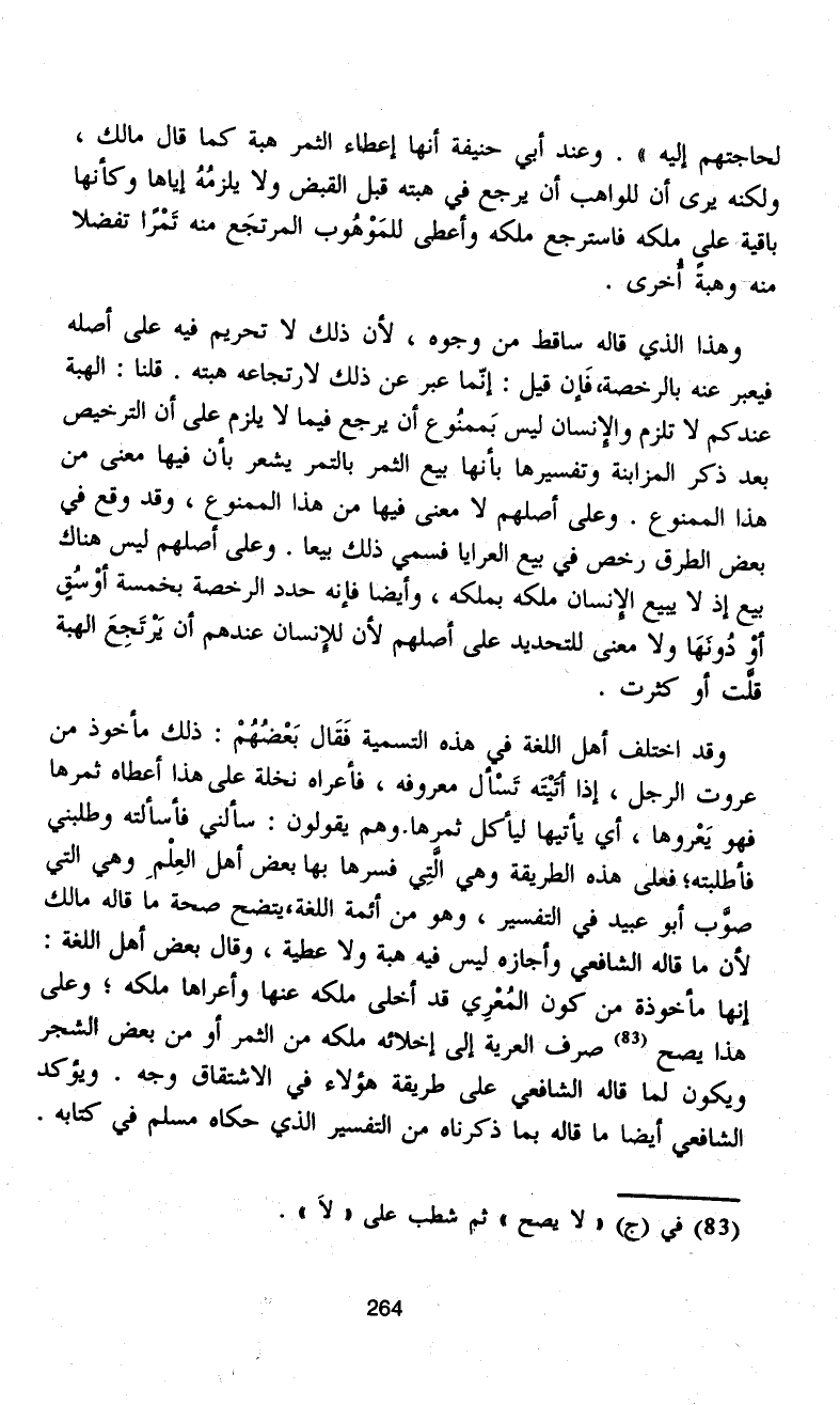 وهذا الذي قاله ساقط من وجوه، لأن ذلك لا تحريم فيه على أصله فيعبر عنه بالرخصة، فَإنْ قيل: إنّما عبر عن ذلك لارتجاعه هبته. قلنا: الهبة عندكم لا تلزم والإِنسان ليس بَممنُوع أن يرجع فيما لا يلزم على أن الترخيص بعد ذكر المزابنة وتفسيرها بأنها بيع الثمر بالتمر يشعر بأن فيها معنى من هذا الممنوع. وعلى أصلهم لا معنى فيها من هذا الممنوع، وقد وقع في بعض الطرق رخص في بيع العرايا فسمي ذلك بيعا. وعلى أصلهم ليس هناك بيع إذ لا يبيع الإِنسان ملكه بملكه، وأيضًا فإنه حدد الرخصة بخمسة أوْسُقٍ أوْ دُونَهَا ولا معنى للتحديد على أصلهم لأن للإِنسان عندهم أن يَرْتَجِعَ الهبة قلَّت أو كثرت.
