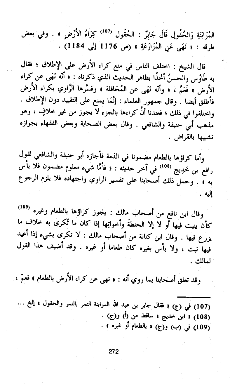 المُزَابَنَةِ وَالحُقُولِ قَالَ جَابِرٌ: الحُقُول (¬107) كِرَاءُ الأرْضِ". وفي بعض طرقه: "نَهَى عَنِ المُزَارَعَةِ" (ص 1176 إلى 1184).