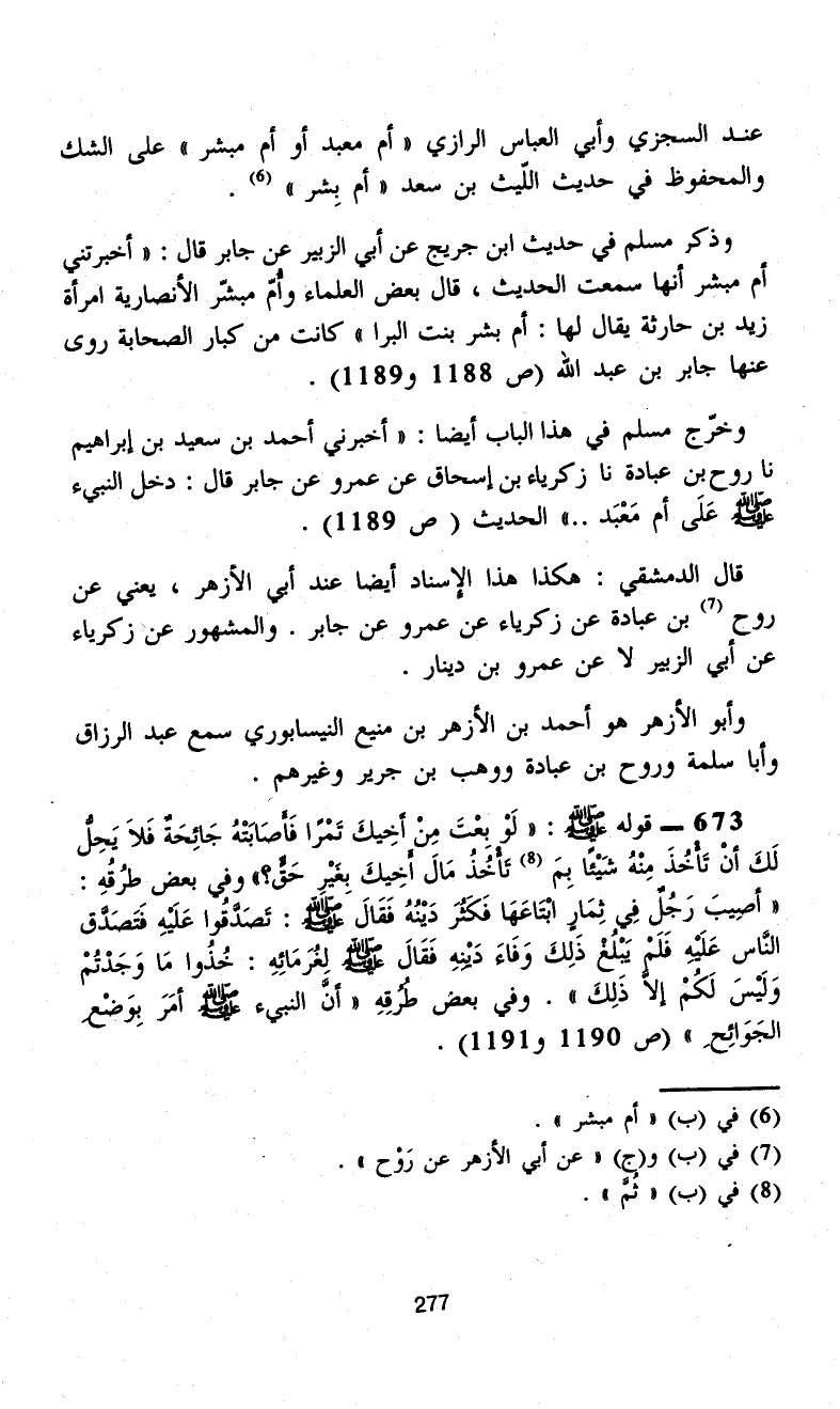 وذكر مسلم في حديث ابن جريج عن أبي الزبير عن جابر قال: "أخبرتني أم مبشر أنها سمعت الحديث، قال بعض العلماء وأمّ مبشّر الأنصارية امرأة زيد بن حارثة يقال لها: أم بشر بنت البرا" كانت من كبار الصحابة روى عنها جابر بن عبد الله (ص 1188 و1189).