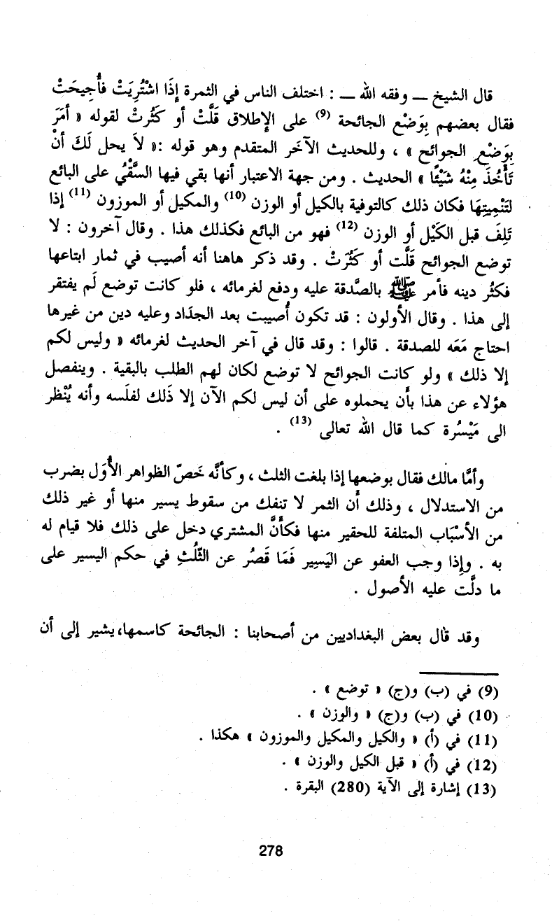 قال الشيخ -وفقه الله-: اختلف الناس في الثمرة إِذَا اشْتُرِيَتْ فأُجِيحَتْ فقال بعضهم بِوَضْع الجائحة (¬9) على الإِطلاق قَلَّتْ أو كَثُرتْ لقوله "أمَرَ بِوَضْعِ الجوائح"، وللحديث الآخَر المتقدم وهو قوله: "لاَ يحل لَكَ أنْ تَأْخُذَ مِنْهُ شَيْئًا"، الحديث. ومن جهة الاعتبار أنها بقى فيها السَّقْيُ على البائع لتَنْمِيتهَا فكان ذلك كالتوفية بالكيل أو الوزن (¬10) والمكيل أو الموزون (¬11) إذا تَلِفَ قبل الكَيْل أو الوزن (¬12) فهو من البائع فكذلك هذا. وقال الآخرون: لا توضع الجوائح قَلَّت أو كَثُرَتْ. وقد ذكر ها هنا أنه أصيب في ثمار ابتاعها فكثُر دينه فأمر - صلى الله عليه وسلم - بالصَّدقة عليه ودفع لغرمائه، فلو كانت توضع لَم يفتقر إلى هذا. وقال الأولون: قد تكون أُصيبت بعد الجدَاد وعليه دين من غيرها احتاج مَعَه للصدقة. قالوا: وقد قال في آخر الحديث لغرمائه "وليس لكم إلا ذلك" ولو كانت الجوائح لا توضع لكان لهم الطلب بالبقية. وينفصل هؤلاء عن هذا بأَن يحملوه على أن ليس لكم الآن إلا ذَلك لفلَسه وأنه يُنْظر إلى مَيْسُرة كما قال الله تعالى (¬13).
