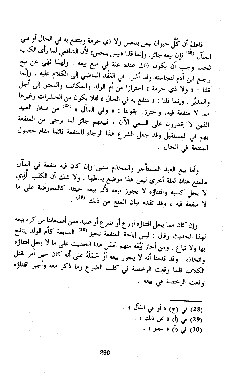 فاعلَمْ أن كُلَّ حيوان ليس بنجس ولا ذي حرمة وينتفع به في الحال أو في المآل (¬28) فإن بيعه جائز. وإنما قلنا "ليس بنجس" لأن الشافعي لما رأى الكلب نَجسا وجب أن يكون ذلك عنده علة في منع بيعه. ولهذا نَهَى عن بيع رجيع ابن آدم لنجاسته. وقد أشرنا في العَقْد الماضي إلى الكلام عليه. وإنَّما قلنا: "ولا ذي حرمة" احترازا من أم الولد والمكاتب والمعتق إلى أجل والمدبَّر. وإنما قلنا: "ينتفع به في الحال" لئلا يكون من الحشرات وغيرها مما لا منفعة فيه. واحترزنا بقولنا: "وفي المآل" (28) من صغار العبيد الذين لا يقدرون على السعي الآن، فبيعهم جائز لما يرجى من المنفعة بهم في المستقبل وقد جعل الشرع هذا الرجاء للمنفعة قائما مقام حصول المنفعة في الحال.