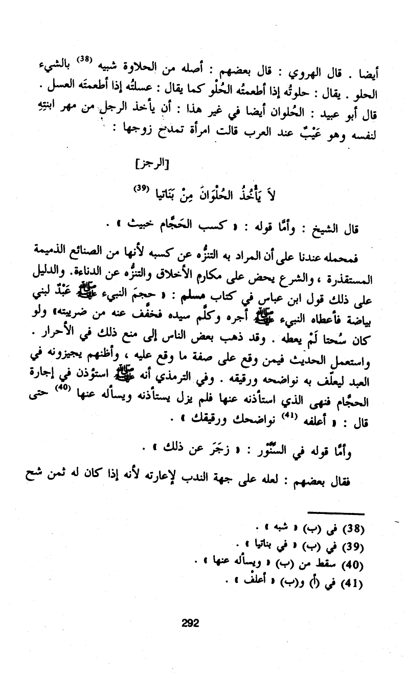 فمحمله عندنا على أن المراد به التنزُّه عن كسبه لأنها من الصنائع الذميمة المستقذرة، والشرع يحض على مكارم الأخلاق والتنزُّه عن الدناءه. والدليل على ذلك قول ابن عباس في كتاب مسلم: "حجمَ النبيء - صلى الله عليه وسلم - عَبْدٌ لبني بياضة فأعطاه النبيء - صلى الله عليه وسلم - أجره وكلَّم سيده فخفَّف عنه من ضريبته" ولو كان سُحتا لَمْ يعطه. وقد ذهب بعض الناس إلى منع ذلك في الأحرار. واستعمل الحديث فيمن وقع على صفة ما وقع عليه، وأظنهم يجيزونه في العبد ليعلّف به نواضحه ورقيقه. وفي الترمذي أنه - صلى الله عليه وسلم - استؤذن في إجارة الحجَّام فنهى الذي استأذنه عنها فلم يزل يستأذنه ويسأله عنها (¬40) حتى قال: "أعلفه (¬41) نواضحك ورقيقك".