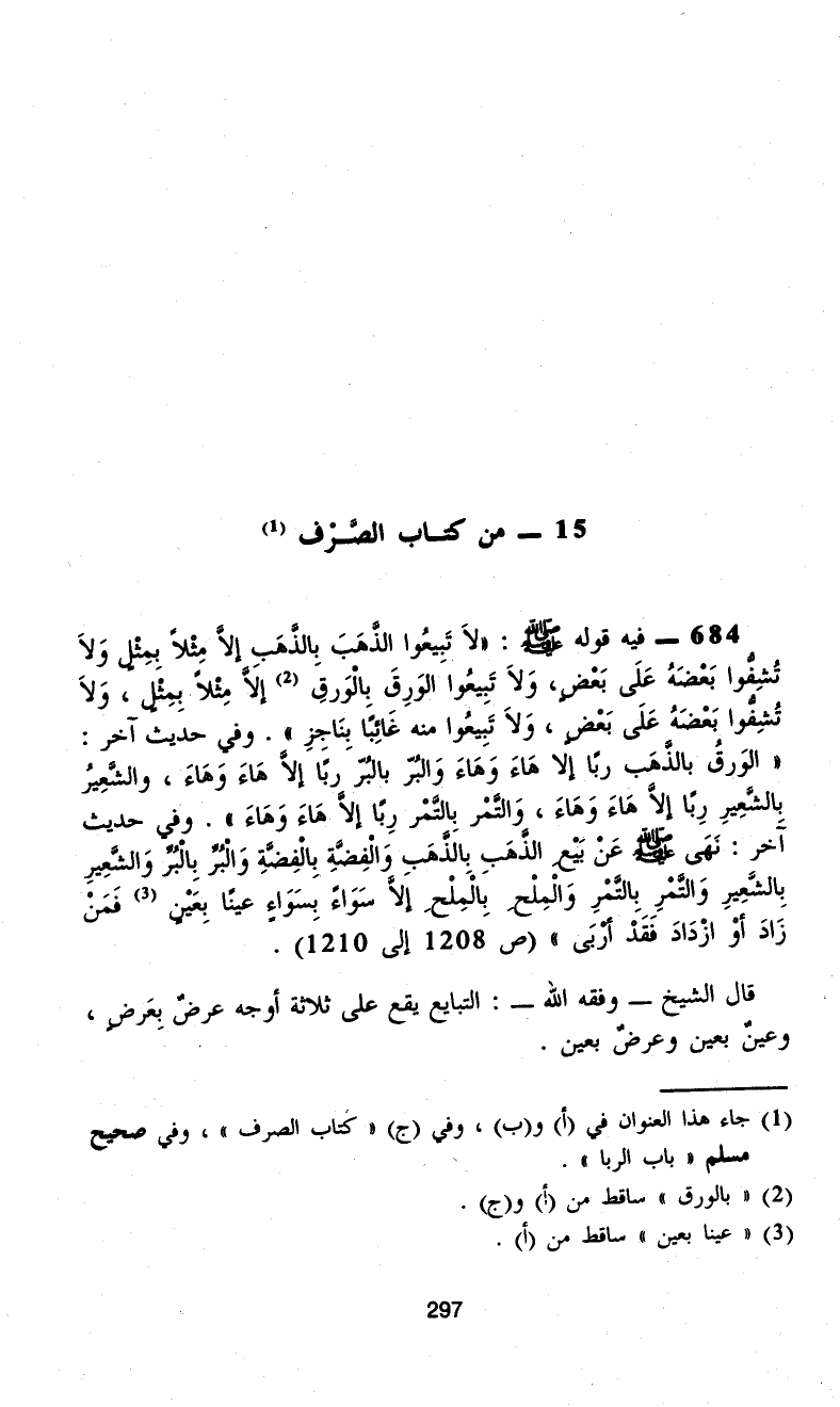 684 - فيه قوله - صلى الله عليه وسلم -: "لاَ تَبِيعُوا الذَّهَبَ بِالذَّهَبِ إلاَّ مِثْلاً بِمِثْلٍ وَلاَ تُشِفُّوا بَعْضَهُ عَلَى بَعْضٍ، وَلاَ تَبِيعُوا الوَرِقَ بالْوَرقِ (¬2) إلاَّ مِثْلاً بِمِثْلٍ، وَلاَ تُشِفُّوا بَعْضَهُ عَلَى بَعْضٍ، وَلاَ تَبِيعُوا منه غَائِبًا بِنَاجِزِ". وفي حديث آخر: "الوَرقُ بالذَّهَب رِبًا إلا هَاءَ وَهَاءَ وَالبُرّ بالبُرّ رِبًا إلاَّ هَاءَ وَهَاءَ، والشَّعِيرُ بالشَّعِيرِ رِبًا إلاَّ هَاءَ وَهَاءَ، وَالتَّمْر بِالتَّمْر رِبًا إلاَّ هَاءَ وَهَاءَ". وفي حديث آخر: نَهَى - صلى الله عليه وسلم - عَنْ بَيْع الذَّهَبِ بالذَّهَبِ وَالْفِضَّةِ بِالْفِضَّةِ وَالبُرِّ بِالْبُرِّ وَالشَّعِيرِ بِالشَّعِيرِ وَالتَّمْرِ بِالتَّمرِ وَالْمِلْحِ بِالْمِلحِ إلاَّ سَوَاءً بِسَوَاءٍ عينًا بِعَيْنٍ (¬3) فَمَنْ زَادَ أوْ ازْدَادَ فَقَدْ أربَى" (ص 1208 إلى 1210).