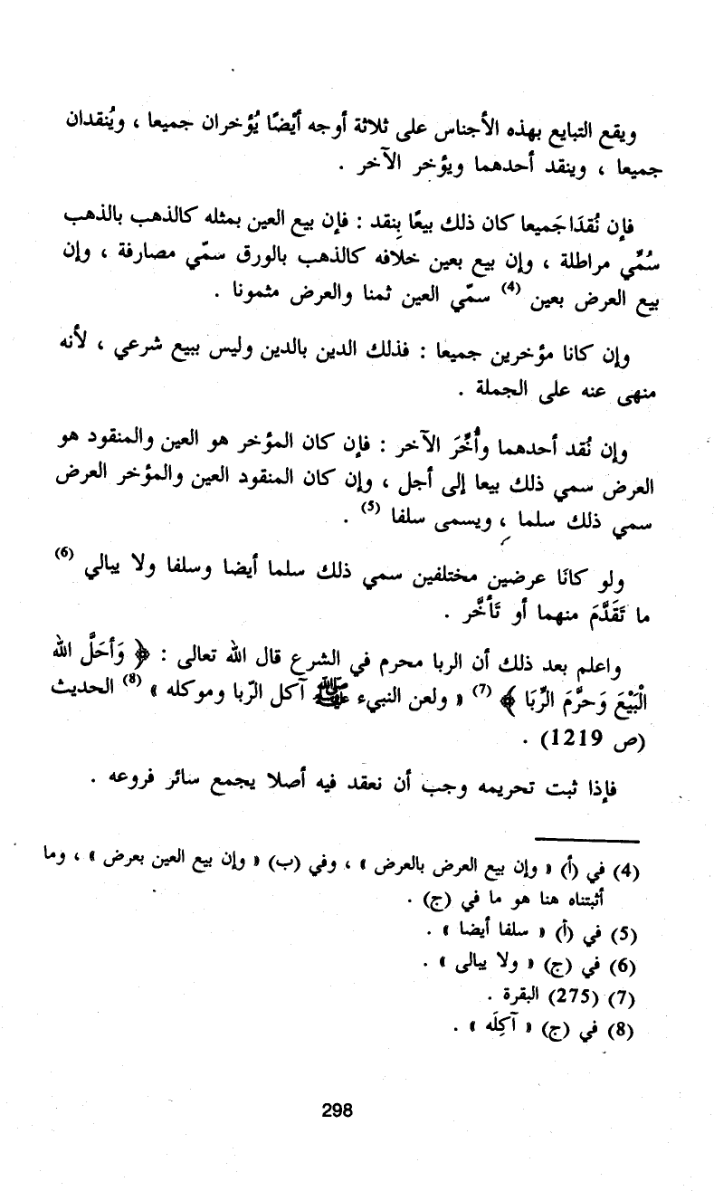 واعلم بعد ذلك أن الربا محرم في الشرع قال الله تعالى: {وَأَحَلَّ اللَّهُ الْبَيْعَ وَحَرَّمَ الرِّبَا} (¬7) "ولعن النبيء - صلى الله عليه وسلم - آكل الرّبا وموكله" (¬8) الحديث (ص 1219).
