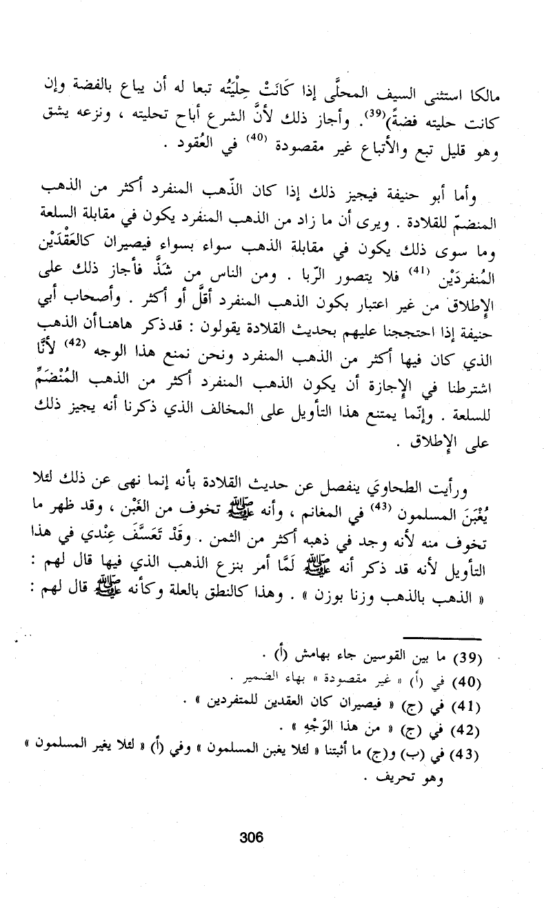 وأما أبو حنيفة فيجيز ذلك إذا كان الذّهب المنفرد أكثر من الذهب المنضمّ للقلادة. ويرى أن ما زاد من الذهب المنفرد يكون في مقابلة السلعة وما سوى ذلك يكون في مقابلة الذهب سواء بسواء فيصيران كالعَقْدَيْن المُنفردَيْن (¬41) فلا يتصور الرّبا. ومن الناس من شَذَّ فأجاز ذلك على الإِطلاقْ من غير اعتبار يكون الذهب المنفرد أقلَّ أو أكثر. وأصحاب أبي حنيفة إذا احتججنا عليهم بحديث القلادة يقولون: قد ذكر ها هنا أن الذهب الذي كان فيها أكثر من الذهب المنفرد ونحن نمنع هذا الوجه (¬42) لأنَّا اشترطنا في الإِجازة أن يكون الذهب المنفرد أكثر من الذهب المُنْضَمِّ للسلعة. وإنّما يمتنع هذا التأويل على المخالف الذي ذكرنا أنه يجيز ذلك على الإِطلاق.