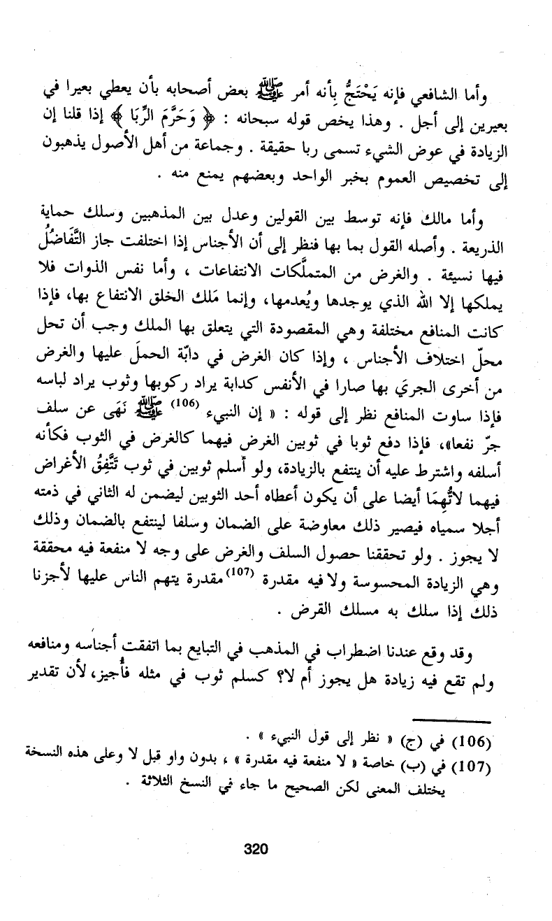 وأما مالك فإنه توسط بين القولين وعدل بين المذهبين وسلك حماية الذريعة. وأصله القول بما بها فنظر إلى أن الأجناس إذا اختلفت جاز التَّفَاضُلُ فيها نسيئة. والغرض من المتملَّكات الانتفاعات، وأما نفس الذوات فلا يملكها إلا الله الذي يوجدها ويُعدمها، وإنما مَلك الخلق الانتفاع بها، فإذا كانت المنافع مختلفة وهي المقصودة التي يتعلق بها الملك وجب أن تحل محلّ اختلاف الأجناس، وإذا كان الغرض في دابّة الحملَ عليها والغرض من أخرى الجريَ بها صارا في الأنفس كدابة يراد ركوبها وثوب يراد لباسه فإذا ساوت المنافع نظر إلى قوله: "إن النبيء (¬106) - صلى الله عليه وسلم - نَهَى عن سلف جرّ نفعا"، فإذا دفع ثوبا في ثوبين الغرض فيهما كالغرض في الثوب فكأنه أسلفه واشترط عليه أن ينتفع بالزيادة، ولو أسلم ثوبين في ثوب تَتَّفِقُ الأغراض فيهما لاتُّهِمَا أيضاً على أن يكون أعطاه أحد الثوبين ليضمن له الثاني في ذمته أجلا سمياه فيصير ذلك معاوضة على الضمان وسلفا لينتفع بالضمان وذلك لا يجوز. ولو تحققنا حصول السلف والغرض على وجه لا منفعة فيه محققة وهي الزيادة المحسوسة ولا فيه مقدرة (¬107) مقدرة يتهم الناس عليها لأجزنا ذلك إذا سلك به مسلك القرض.