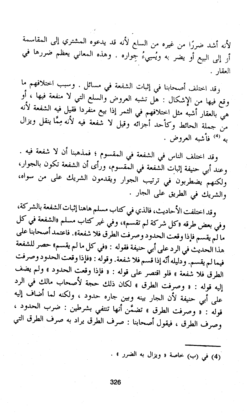 وقد اختلفت الأحاديث، فالذي في كتاب مسلم ها هنا إثبات الشفعة بالشركة، وفي بعض طرقه "كل شركة لم تقسم"، وفي غير كتاب مسلم "الشفعة في كل ما لم يقسم فإذا وقعت الحدود وصرفت الطرق فلا شفعة". فاعتمد أصحابنا على هذا الحديث في الرد على أبي حنيفة فقوله: "في كل ما لم يقسم" حصر للشفعة فيما لم يقسم. ودليله أنّه إذا قسم فلا شفعة. وقوله: "فإذا وقعت الحدود وصرفت الطرق فلا شفعة" فلو اقتصر على قوله: "فإذا وقعت الحدود" ولم يضف إليه قوله: "وصرفت الطرق" لكان ذلك حجة لأصحاب مالك في الرد على أبي حنيفة لأن الجار بينه وبين جاره حدود، ولكنه لما أضاف إليه قوله: "وصرفت الطرق" تضمَّن أنها تنتفي بشرطين: ضرب الحدود، وصرف الطرق، فيقول أصحابنا: صرف الطرق يراد به صرف الطرق التي