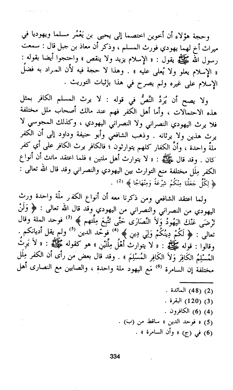 ولما اعتقد الشافعي ومن ذكرنا معه أن أنواع الكفر ملّة واحدة ورث اليهودي من النصراني والنصراني من اليهودي وقد قال الله تعالى: {وَلَنْ تَرْضَى عَنْكَ الْيَهُودُ وَلَا النَّصَارَى حَتَّى تَتَّبِعَ مِلَّتَهُمْ} (¬3) فوحد الملة وقال تعالى: {لَكُمْ دِينُكُمْ وَلِيَ دِينِ} (¬4) فوحّد الدين (¬5) ولم يقل أديانكم. وقالوا: قوله - صلى الله عليه وسلم -: "لا يتوارث أهْلُ مِلَّتَيْنِ" هو كقوله - صلى الله عليه وسلم -: "لاَ يَرِثُ المُسْلِمُ الكَافِرَ وَلاَ الكَافِر المُسْلِمَ ". وقد قال بعض من رأى أن الكفر مِلَل مختلفة إن السامرة (¬6) مَع اليهود ملة واحدة، والصابين مع النصارى أهل