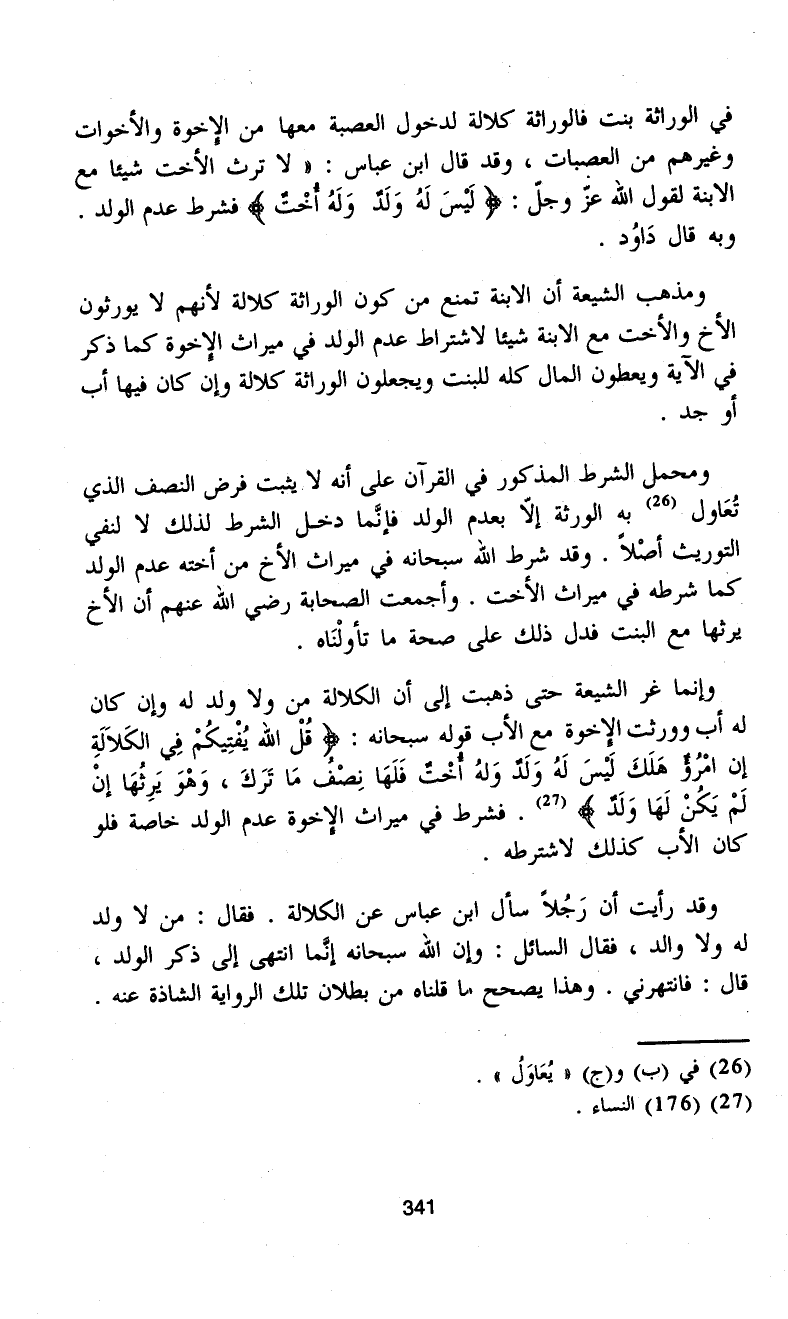 وإنما غر الشيعة حتى ذهبت إلى أن الكلالة من ولا ولد له وإن كان له أب وورثت الإِخوة مع الأب قوله سبحانه: {قُلِ اللَّهُ يُفْتِيكُمْ فِي الْكَلَالَةِ إِنِ امْرُؤٌ هَلَكَ لَيْسَ لَهُ وَلَدٌ وَلَهُ أُخْتٌ فَلَهَا نِصْفُ مَا تَرَكَ وَهُوَ يَرِثُهَا إِنْ لَمْ يَكُنْ لَهَا وَلَدٌ} (¬27). فشرط في ميراث الإِخوة عدم الولد خاصة فلو كان الأب كذلك لاشترطه.