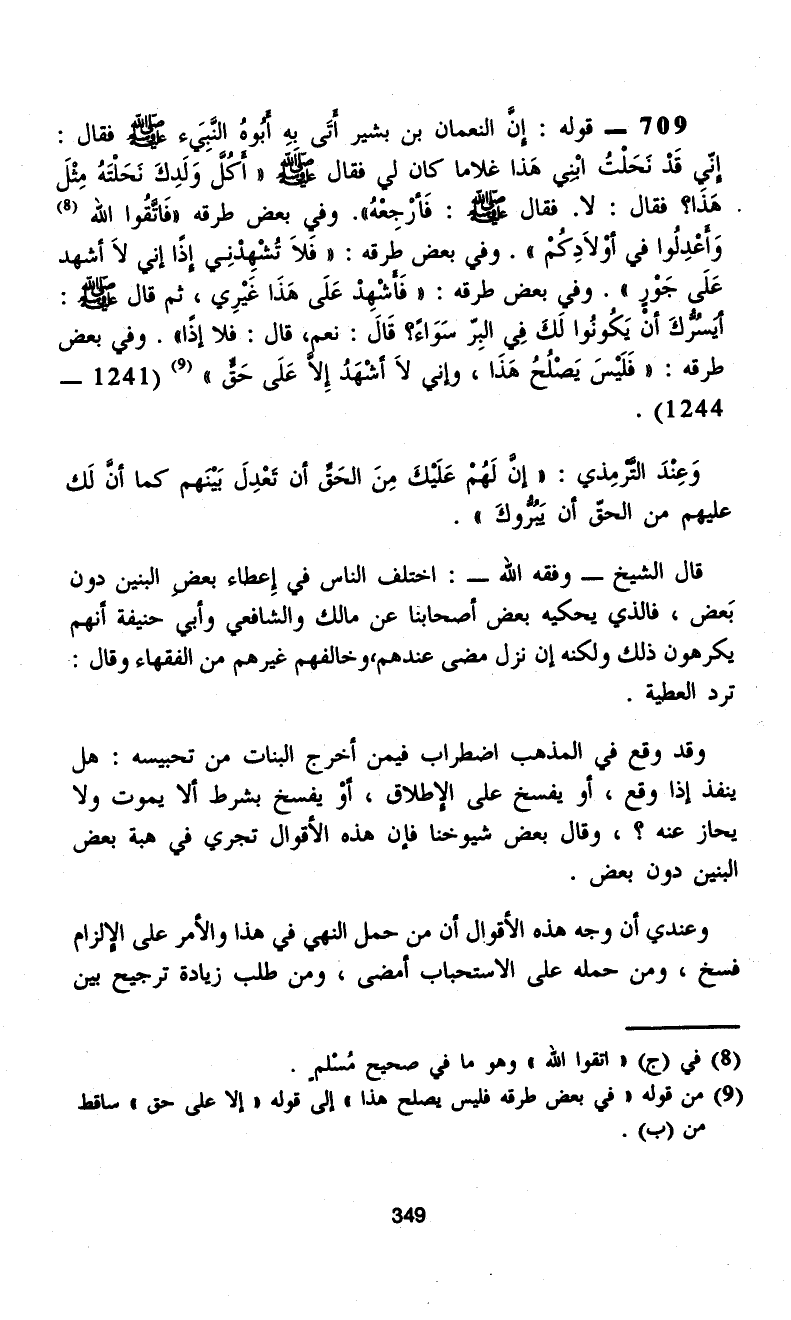 709 - قوله: إِنَّ النعمان بن بشير أَتَى بهِ أَبُوهُ النَّبِيَء - صلى الله عليه وسلم - فقال: إِنّيِ قَدْ نَحَلْتُ ابْنِي هَذا غلاما كان لي فقال - صلى الله عليه وسلم - "أَكُلَّ وَلَدِكَ نَحَلْتَهُ مِثْلَ هَذَا؟ فقال: لا. فقال - صلى الله عليه وسلم -: فَأرْجِعْهُ". وفي بعض طرقه "فَاتَّقُوا الله (¬8) وَأَعْدِلُوا في أوْلاَدِكُمْ". وفي بعض طرقه: "فلاَ تُشْهِدْنِي إذًا إني لاَ أشهد عَلَى جَوْرٍ". وفي بعض طرقه: "فَأَشْهِدْ عَلَى هَذَا غَيْرِي، ثم قال - صلى الله عليه وسلم -: أيَسُرُّكَ أنْ يَكُونُوا لَكَ فِي البِرّ سَوَاءً؟ قَالَ: نعم، قال: فلا إذًا". وفي بعض طرقه: "فَلَيْسَ يَصْلُحُ هَذَا، وإني لاَ أَشْهَدُ إِلاَّ عَلَى حَقٍّ" (¬9) (1241 - 1244).