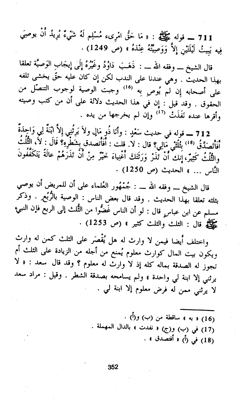 711 - قوله - صلى الله عليه وسلم -: "مَا حَقُّ امْرِىء مُسْلِم لَهُ شَيْءٌ يُرِيدُ أَنْ يوصِيَ فِيه يَبِيتُ لَيْلَتَيْنِ إِلاَّ وَوَصِيَّتُهُ عِنْدَهُ" (ص 1249).