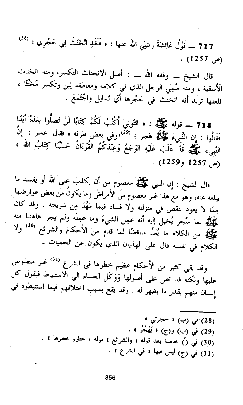 718 - قوله - صلى الله عليه وسلم -: "ائتُونِي أَكْتُبْ لَكُمْ كِتَابًا لَنْ تَضلُّوا بعْدَهُ أبَدًا فَقَالُوا: إن النَّبِيءَ - صلى الله عليه وسلم - هَجر" (¬29)، وفي بعض طرقه "فقال عمر: إِنَّ النَّبِيء - صلى الله عليه وسلم - قَدْ غَلَبَ عَلَيْهِ الوَجَعُ وَعِنْدَكُمُ القُرْءَانُ حَسْبُنَا كِتَابُ الله" (ص 1257 و 1259).