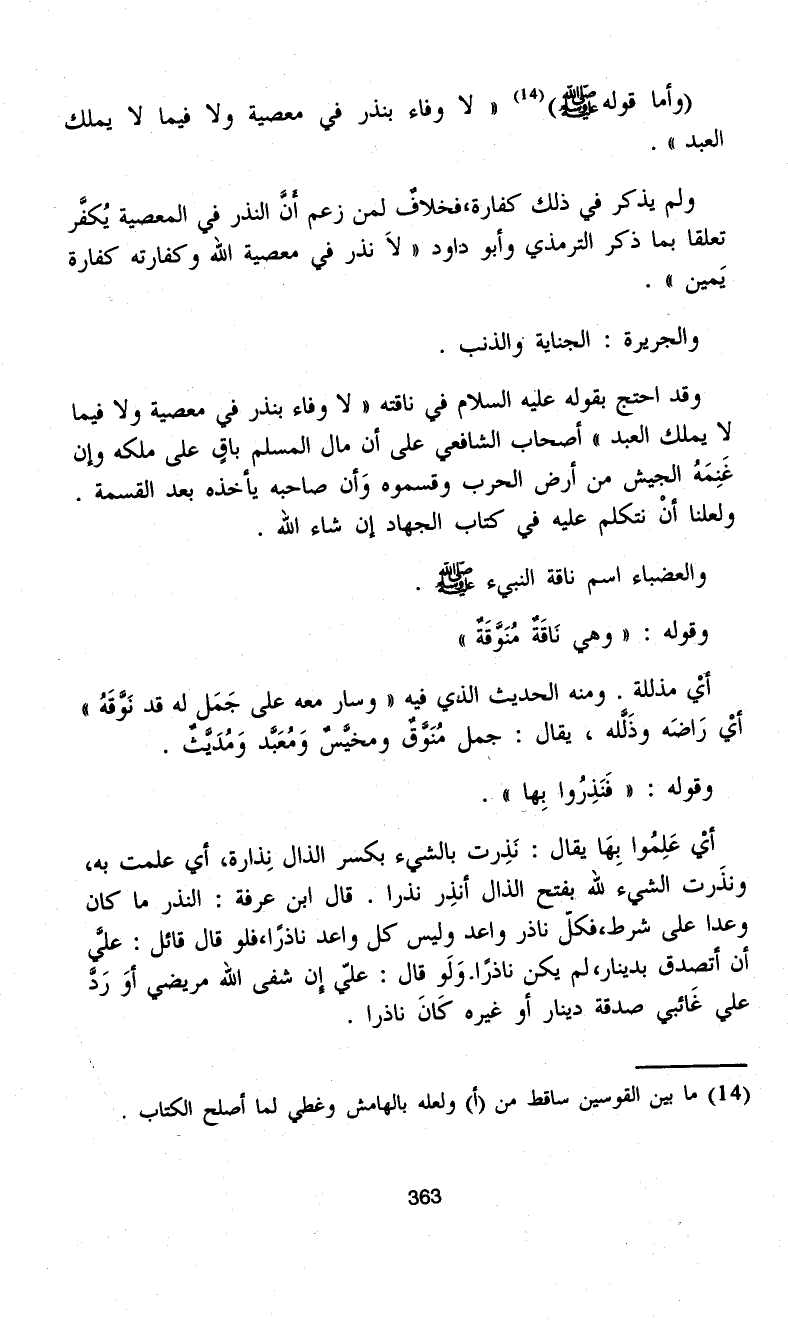 (وأما قوله - صلى الله عليه وسلم -) (¬14) "لا وفاء بنذر في معصية ولا فيما لا يملك العبد".