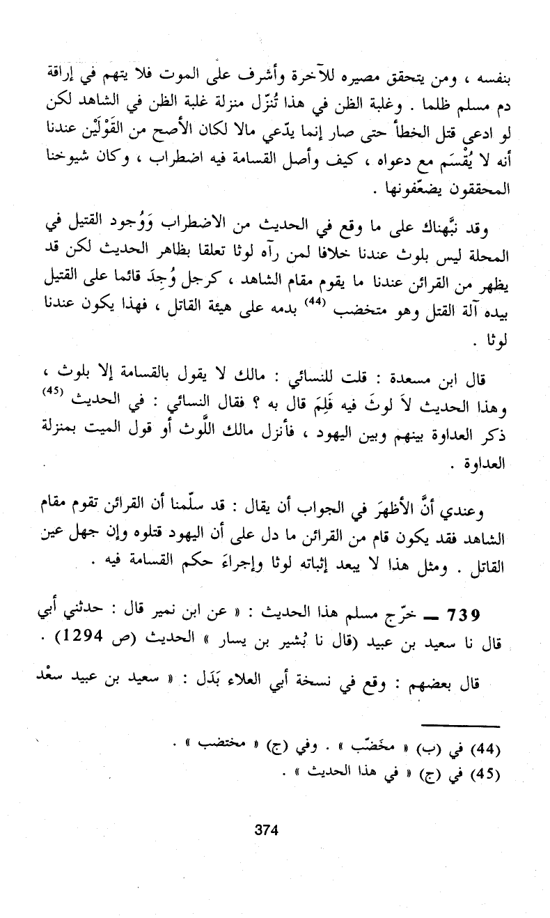 وقد نبَّهناك على ما وقع في الحديث من الاضطراب وَوُجود القتيل في المحلة ليس بلوث عندنا خلافا لمن رآه لوثا تعلقا بظاهر الحديث لكن قد يظهر من القرائن عندنا ما يقوم مقام الشاهد، كرجل وُجِدَ قائما على القتيل بيده آلة القتل وهو متخضب (¬44) بدمه على هيئة القاتل، فهذا يكون عندنا لوثا.