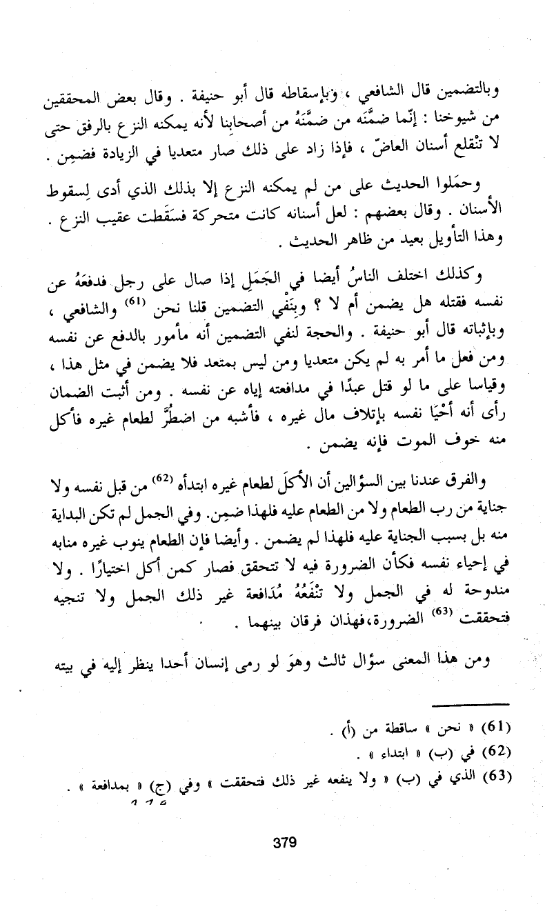 والفرق عندنا بين السؤالين أن الأكلَ لطعام غيره ابتدأه (¬62) من قبل نفسه ولا جناية من رب الطعام ولا من الطعام عليه فلهذا ضمِن. وفي الجمل لم تكن البداية منه بل بسبب الجناية عليه فلهذا لم يضمن. وأيضاً فإن الطعام ينوب غيره منابه في إحياء نفسه فكأن الضرورة فيه لا تتحقق فصار كمن أكل اختيارًا. ولا مندوحة له في الجمل ولا تنْفَعُهُ مُدَافعة غير ذلك الجمل ولا تنجيه فتحققت (¬63) الضرورة، فهذان فرقان بينهما.