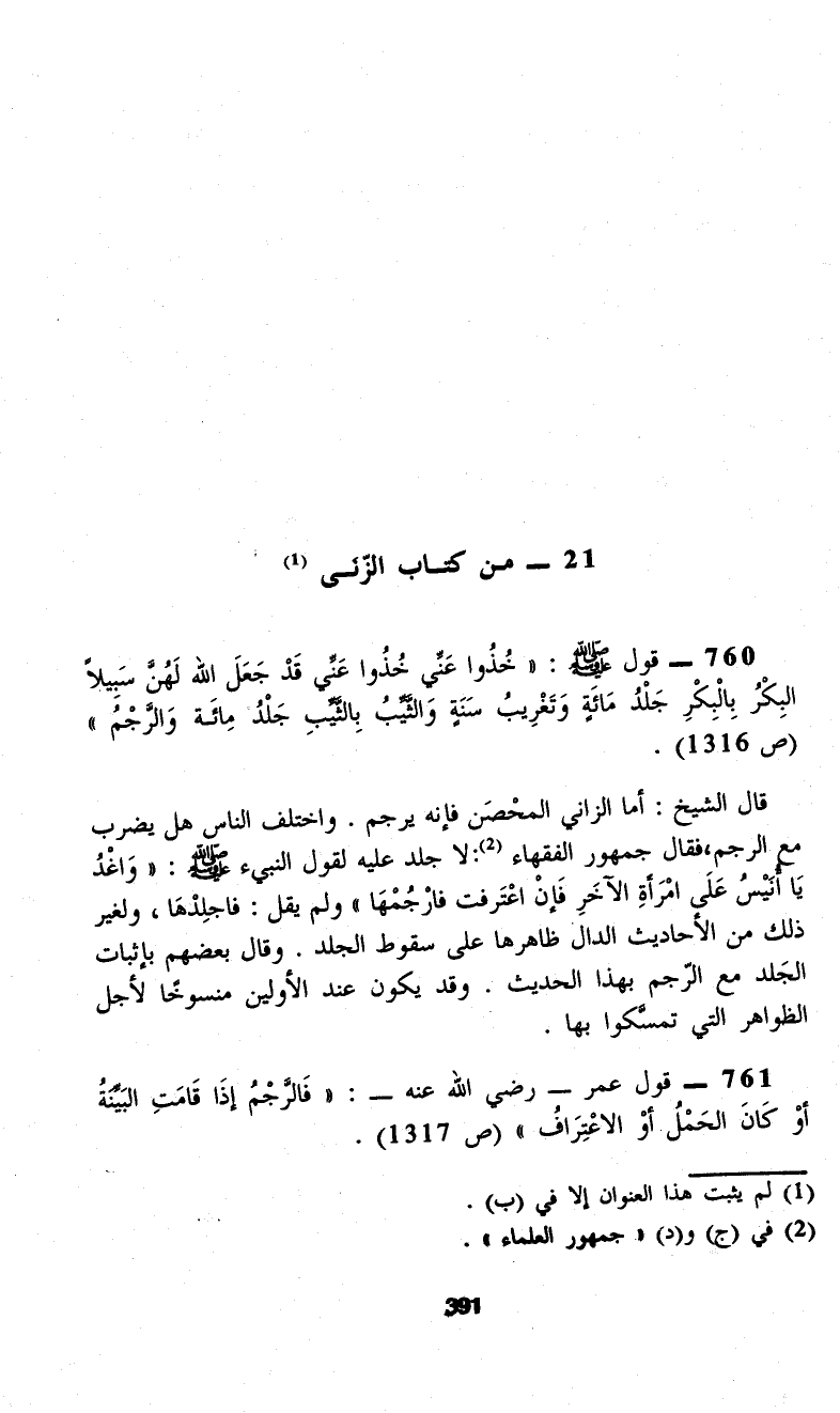760 - قول - صلى الله عليه وسلم -: "خُذُوا عَنِّي خُذُوا عَنِّي قَدْ جَعَلَ الله لَهُنَّ سَبِيلاً البِكْرُ بِالْبِكْرِ جَلْدُ مَائَةٍ وَتَغْرِيبُ سَنَةٍ وَالثَّيِّبُ بالثَّيِّب جَلْدُ مائَة وَالرَّجْمُ " (ص 1316).