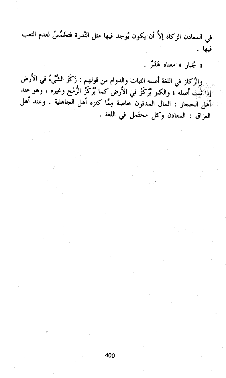 والرِّكاز في اللغة أصله الثبات والدوام من قولهم: زَكَزَ الشَّيْءُ في الأرض إذا ثبت أصله؛ والكنز يُرْكَزُ في الأرض كما يُرْكَزُ الرُّمْح وغيره، وهو عند أهل الحجاز: المال المدفون خاصة مِمَّا كنزه أهل الجاهلية. وعند أهل العراق: المعادن وكل محتَمل في اللغة.